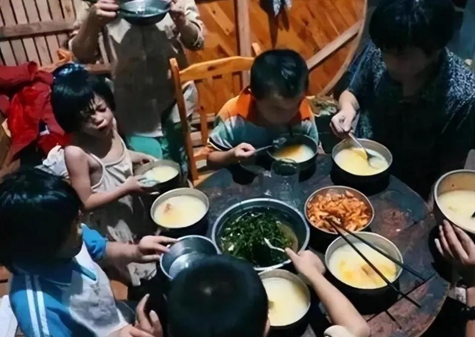 孩子们平时吃的是稀饭加咸菜,衣服都是别人送的旧衣服改的。