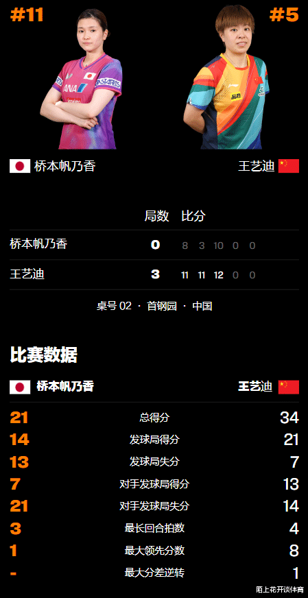 本场比赛王艺迪打得非常有耐心,始终在场上压制着桥本帆乃香,最终直落三局以大比分3-0获胜,打破了自己面对桥本的不胜魔咒!