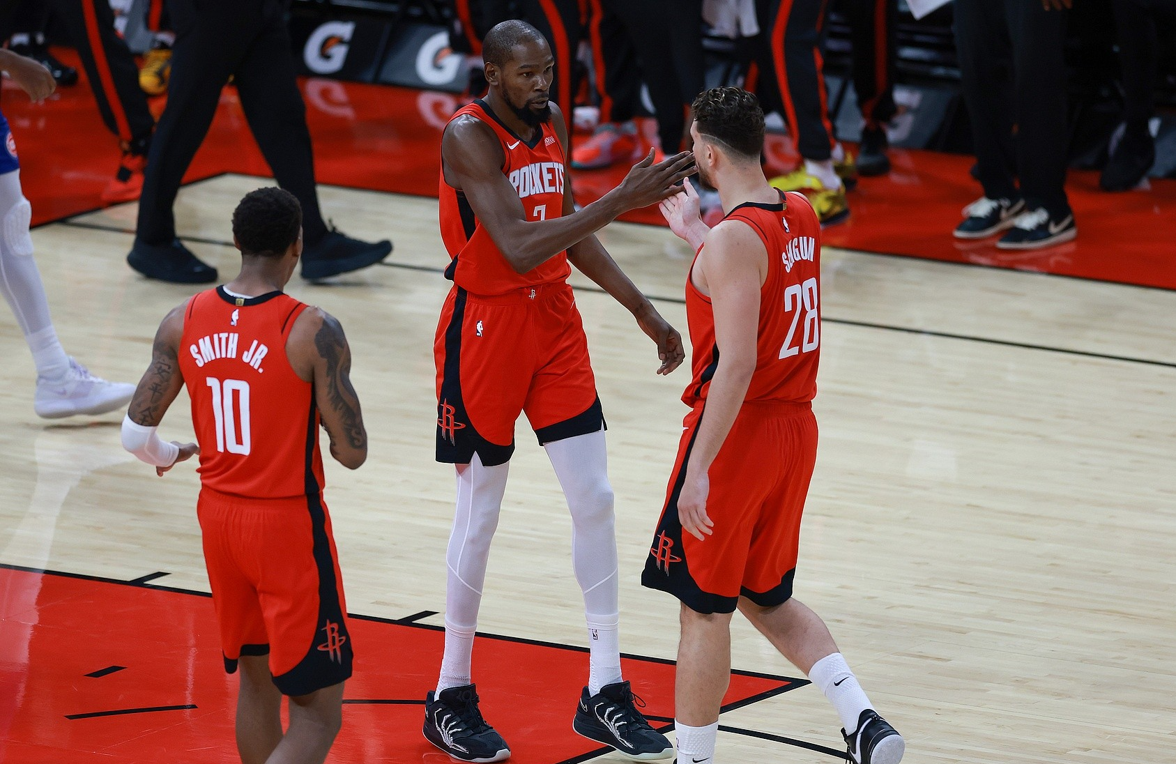 目前,在申京休战期间,火箭的打法是杜兰特无差别单打,成为火箭头号进攻选择,当对手不包夹,杜兰特能无差别立棍单打打死对手,当对手包夹,杜兰特将球传给其他球员,火箭其他球员面临4打3的局面,能得到空位的机会,无论是史密斯、谢泼德、伊森命中空位三分,还是传给内切的阿门或者伊森,造成犯规或者轻松内切得手,杜兰特是火箭进攻的核心。