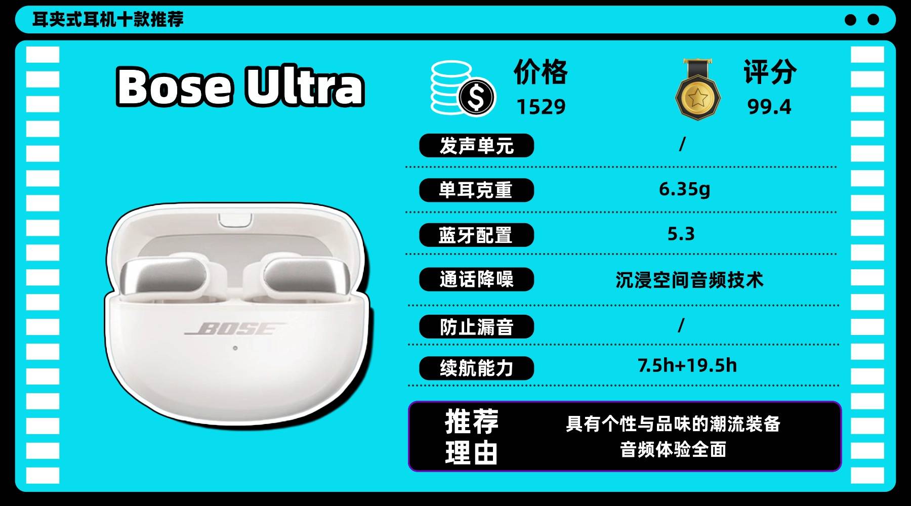 耳夹式耳机买什么品牌,单耳约 6.35g,超软硅胶与贴合耳廓的结构让佩戴体验很稳,不过耳挂面积较大,在夏季或运动出汗时会稍微有点闷。音质搭载 Bose SimpleSyncr™ 和骁龙畅听平台,结合开放式声场技术,声音层次丰富,空间感明显;支持沉浸式空间音频降噪,通话清晰,但在强风环境下表现会受一点影响。续航单次约 7.5 小时,带盒累计约 19.5 小时,满足日常通勤使用没问题,但同价位对比续航属于中规中矩。比较适合预算高、追求沉浸空间听感的用户。