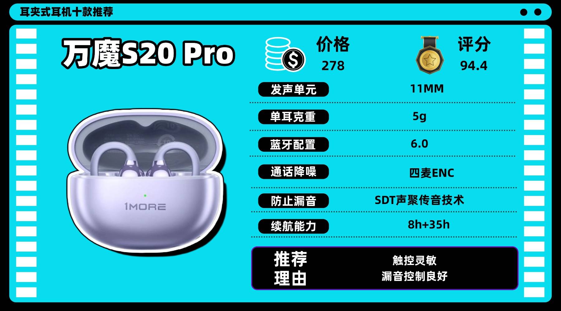 耳夹式耳机买什么品牌,单耳仅 5g,搭配 BalanceAIR+2.0 舒适佩戴结构与 U 型记忆钛丝,轻盈贴耳,长时间戴也不会产生明显压迫感。内置 SDT 声聚传音与 29° 定向传声设计,能降低漏音与外界干扰,使听歌与通话保持清晰。音质方面,11mm 单元结合 Hi-Res 金标认证中高频清晰自然,再加上空间环绕音效带来更立体的听觉体验。支持蓝牙 6.0 与灵敏触控,可在 APP 调整音效并开启低延迟游戏模式,续航单次约 8 小时,加上充电盒总续航可达 35 小时,应对整天使用完全够用。