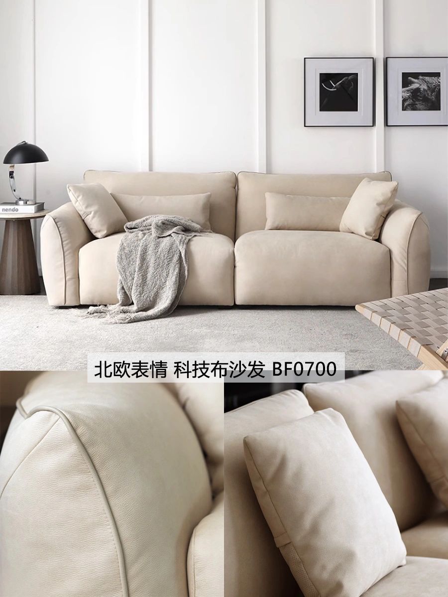 新型科技布,兼具真皮质感和布艺的透气性。复合配比填充,柔软中自带筋骨,稳稳承托身体全落地设计,通身柔软友好不磕碰。