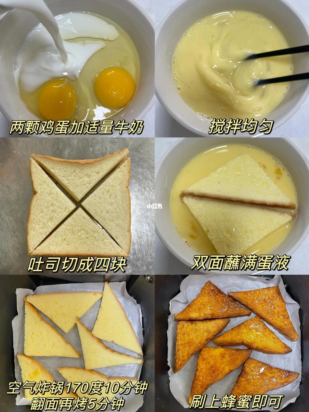 吐司这个做法真的吃一个星期都不腻! 空气炸锅蜂蜜吐司!! 外酥里嫩 奶香味超浓郁~ 再淋上蜂蜜也太好吃了吧~ 家里有吐司的赶紧去做!! - 食材:吐司 蜂蜜 鸡蛋 牛奶 步骤如图⬆️做法简单懒人 ⚠️ 一定要记得垫油纸哦 不然会粘