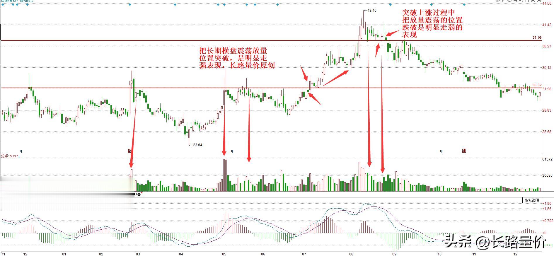 而股价在这种走强上涨过程,明显由强转弱的一个标准表现就是,股价在上涨震荡过程中,是否破掉放量震荡位置。