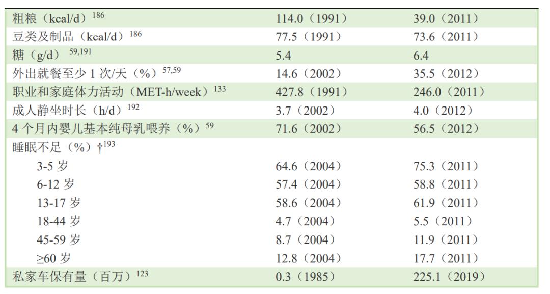 尽管1982年至2012年间的总能量摄入量有所减少,但脂肪占总能量百分比却从18.4%上升到31.5%,食用油摄入量也有所上升,此外总体力活动量大幅减少,且可抵消总能量摄入的降低,导致能量过剩。