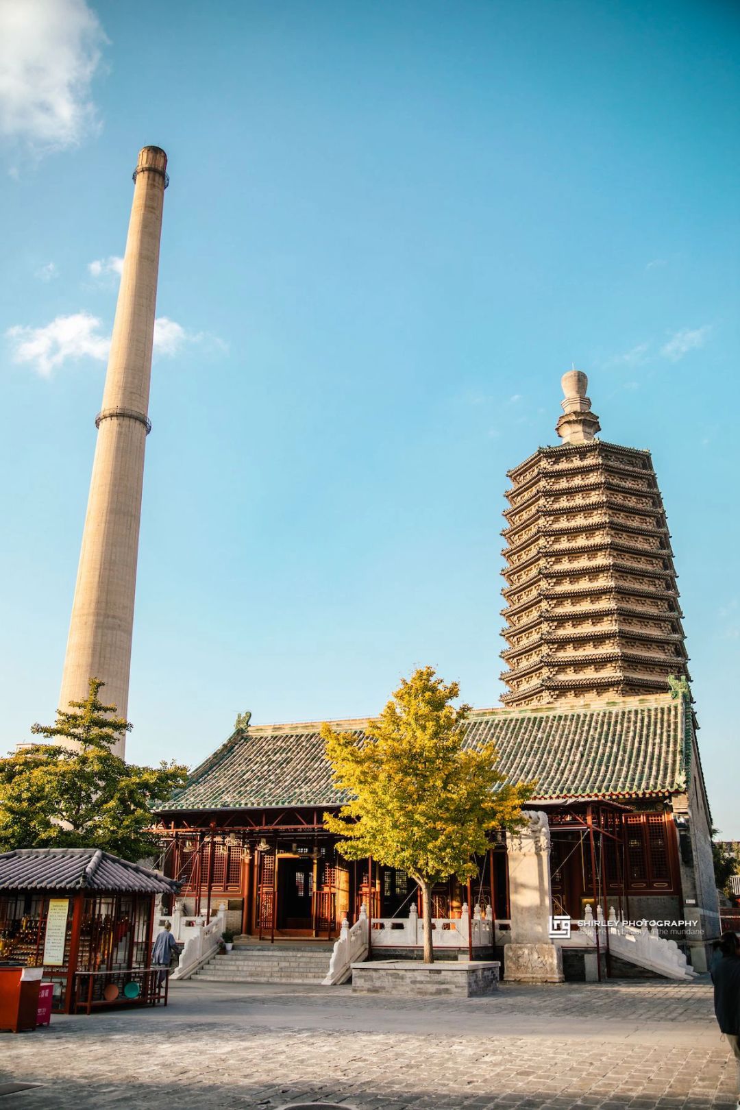 拍摄天宁寺塔,很多时候都避不开旁边那个巨大的烟囱。这一高达180米的烟囱原属建于1976年的北京第二热电厂,现在成为了“天宁1号”文化创意园的一部分,同样代表着一个时代。如今,一边是近千年的辽代砖塔,一边是老厂房和大烟囱,两者以古今对望的姿态一同见证了历史的变迁。