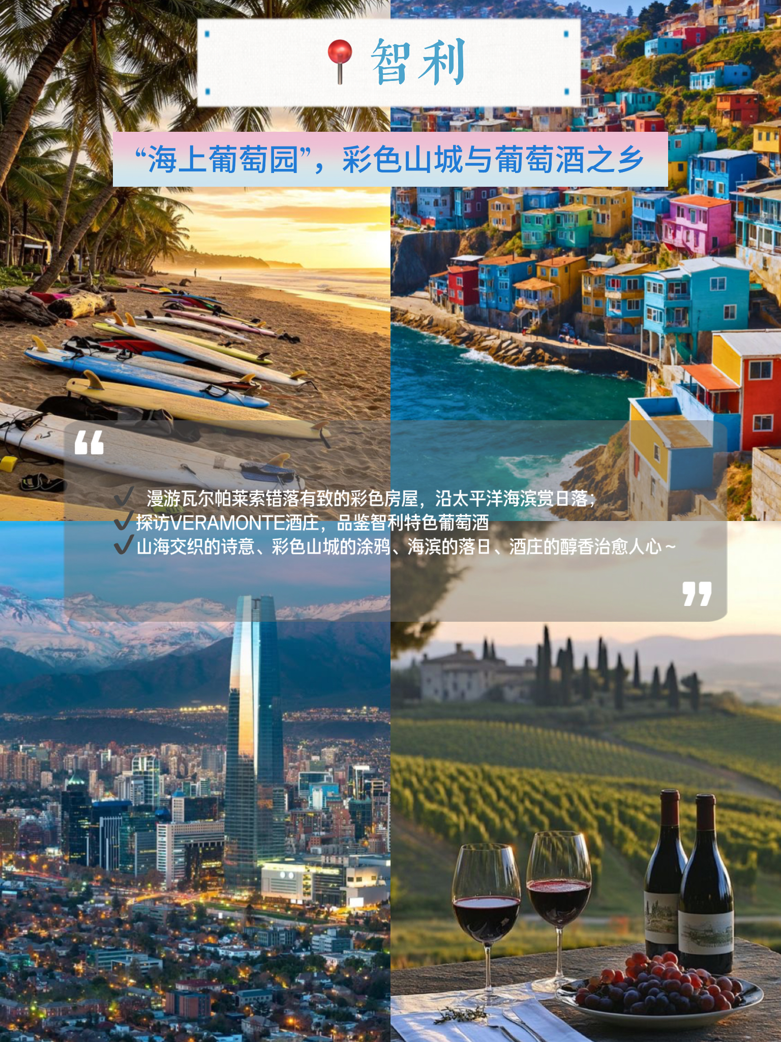 · 智利海滨+酒庄:圣地亚哥赴威尼亚海滨看太平洋日落,再探访当地酒庄,品鉴南美佳酿配海鲜。