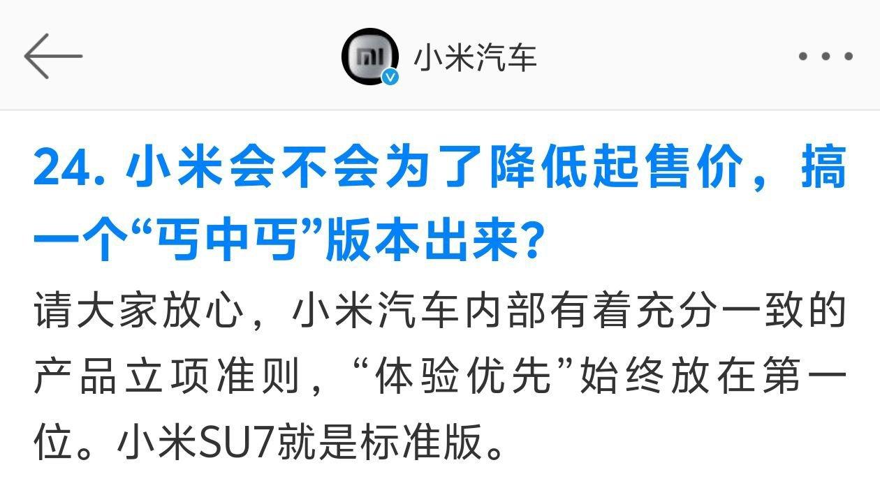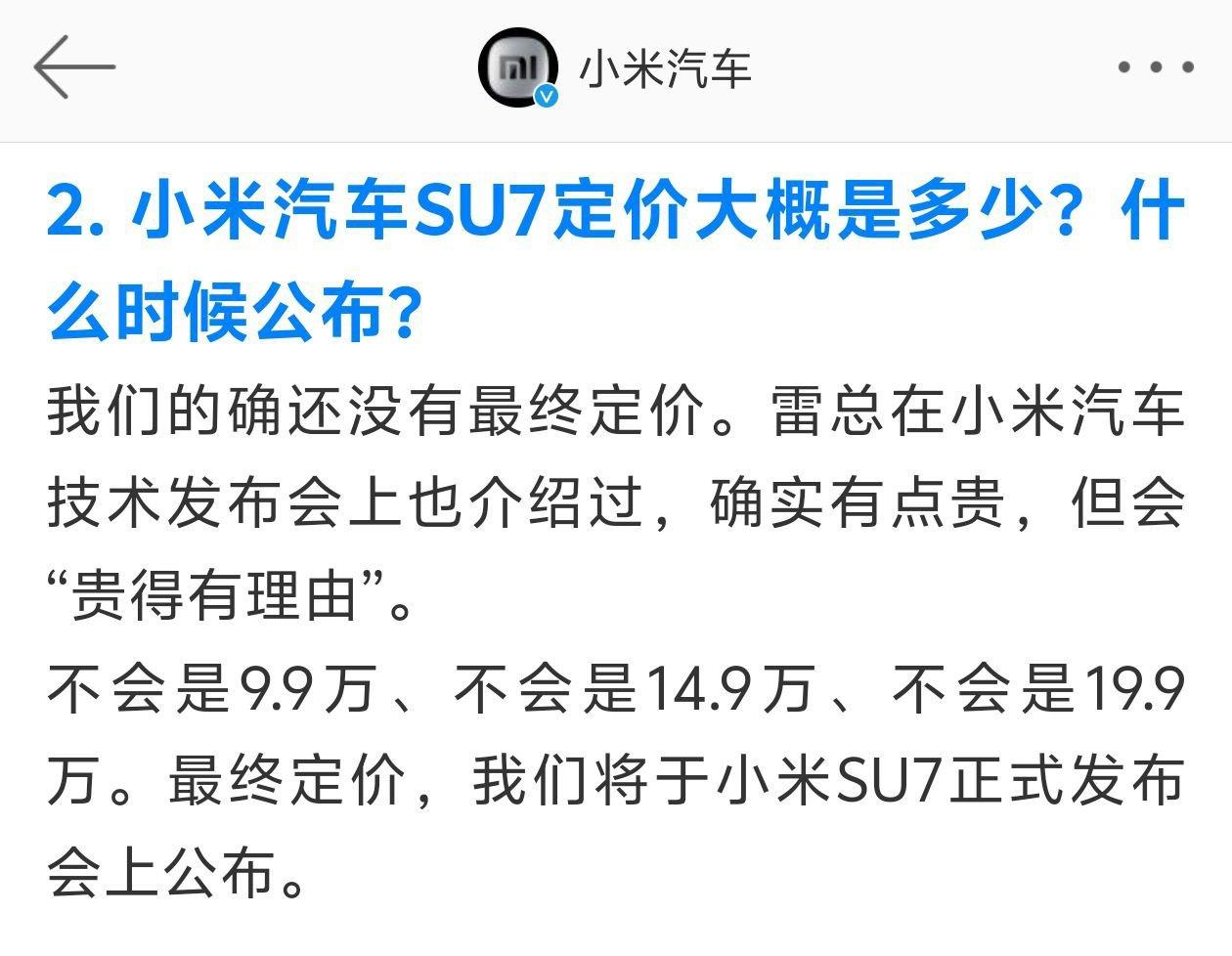 小米汽车答网友100问第一期有33个问题。 里面有我关注的三个问题: 1.小米汽车除了目前公布的海湾蓝、橄榄绿、雅灰三个颜色外,还有更多颜色可以选择; 2.小米汽车不会为了拉低起售价有丐中丐版本,SU7 就是标准版; 3.最关心的售价,我记得雷总在发布会上说了不会是9.9万,14.9万,但是好像没说19.9万,在今天的文章中又说不会19.99万。 [流泪] 那他到底多少钱啊?