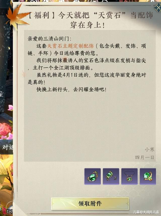 开玩笑,其实给大家发的是天赏石定制配饰,把价值昂贵的天赏石制成饰品,让玩家们佩戴整活,或者增加某种玄学能量,企图让开天赏的概率增加。
