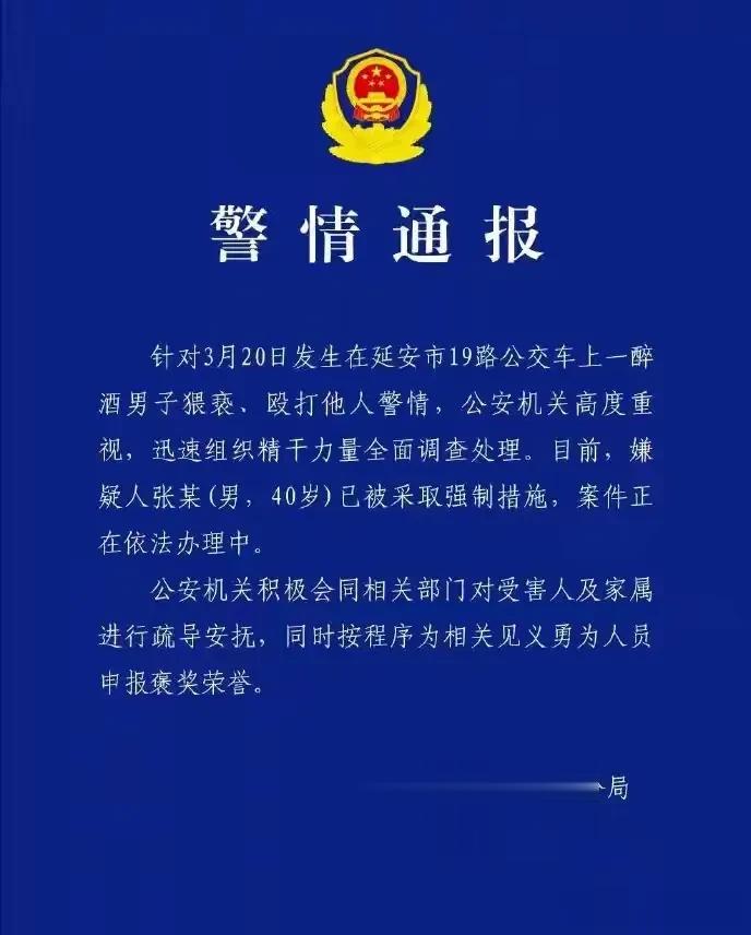 3月21日晚,延安市公安局宝塔分局发布警情通报:嫌疑人张某(男,40岁)已被采取强制措施,案件正在依法办理中。