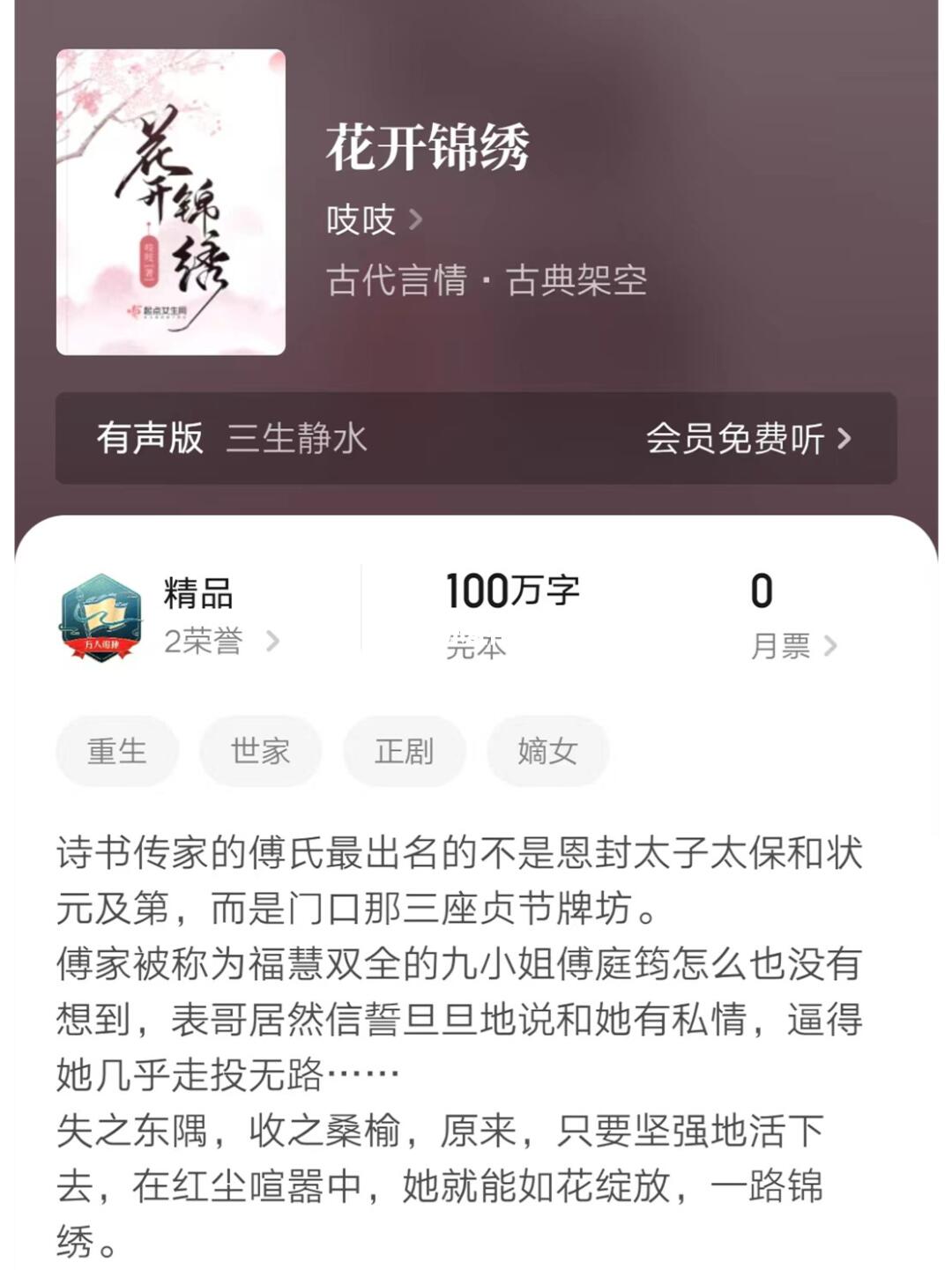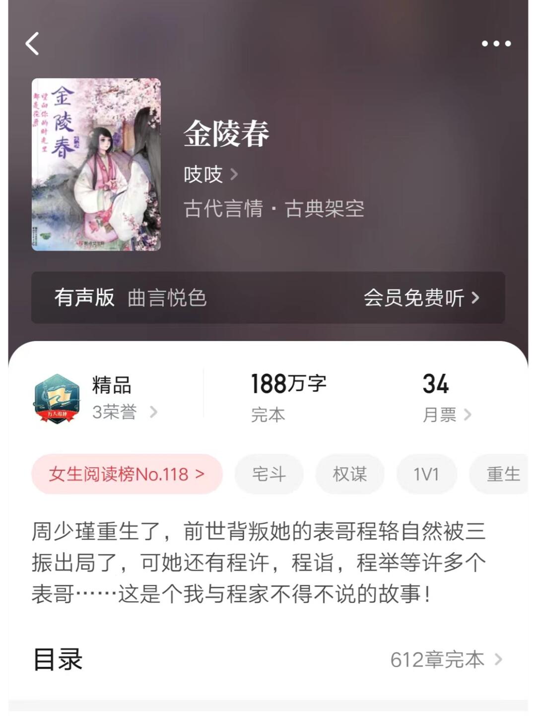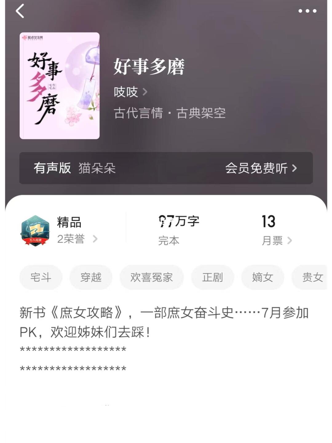 吱吱大大的文基本是以古代言情为主,文笔细腻,宅斗、种田文、权谋、日常、慢热、家长里短,是喜欢宅斗古风向的友友们千万不能错过的宝藏作者!