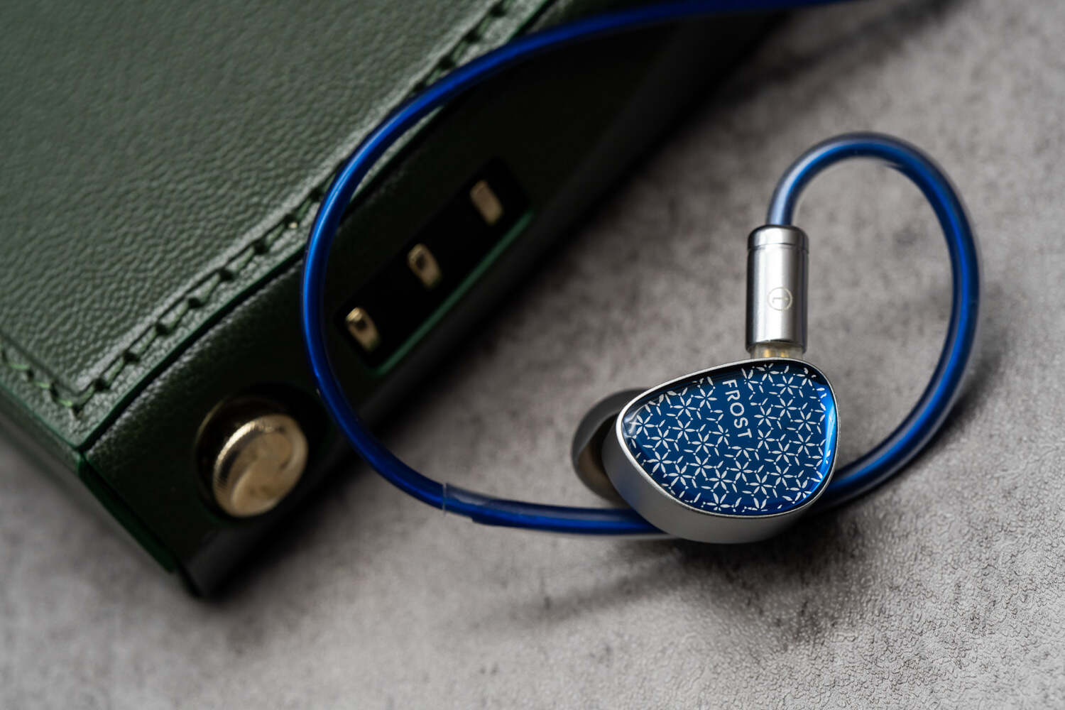 FROST从耳机面板到线材的颜色都是较深的湖蓝,视觉印象深刻。耳机腔体是细磨砂材质的铝合金,工艺精湛;这塞子外观设计上最大的亮点是面板采用的这块蓝色底的高透水晶玻璃,内有白色的霜花状重复条纹,两者结合之下有种小家碧玉般的精致感。FROST标配的耳套外壁有些偏软,我个人不太用得惯,好在这塞子腔体背面的凸出部分较浅,导管也不长,对各种第三方耳套的适配很友好,可以随便换;虽然是金属腔体但没什么坠胀感,佩戴舒适度良好。