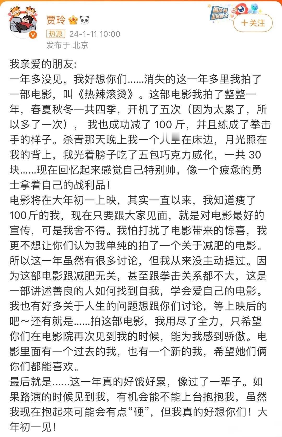 #冬日生活打卡季# 贾玲越来越让人刮目相看了! 曾经的贾玲就是一个谐星,谁能想到她竟是一匹黑马! 以前的《你好,李焕英》现在的《热辣滚烫》有点贾玲出品必是精品的感觉了! 好真挚的情感,她说的没错只要现在她出来露个脸一定会起到宣传的作用! 但是她并没有这么做,贾玲真让人刮目相看!#贾玲太真诚了# #贾玲是我的目标# #贾玲真够拼的#