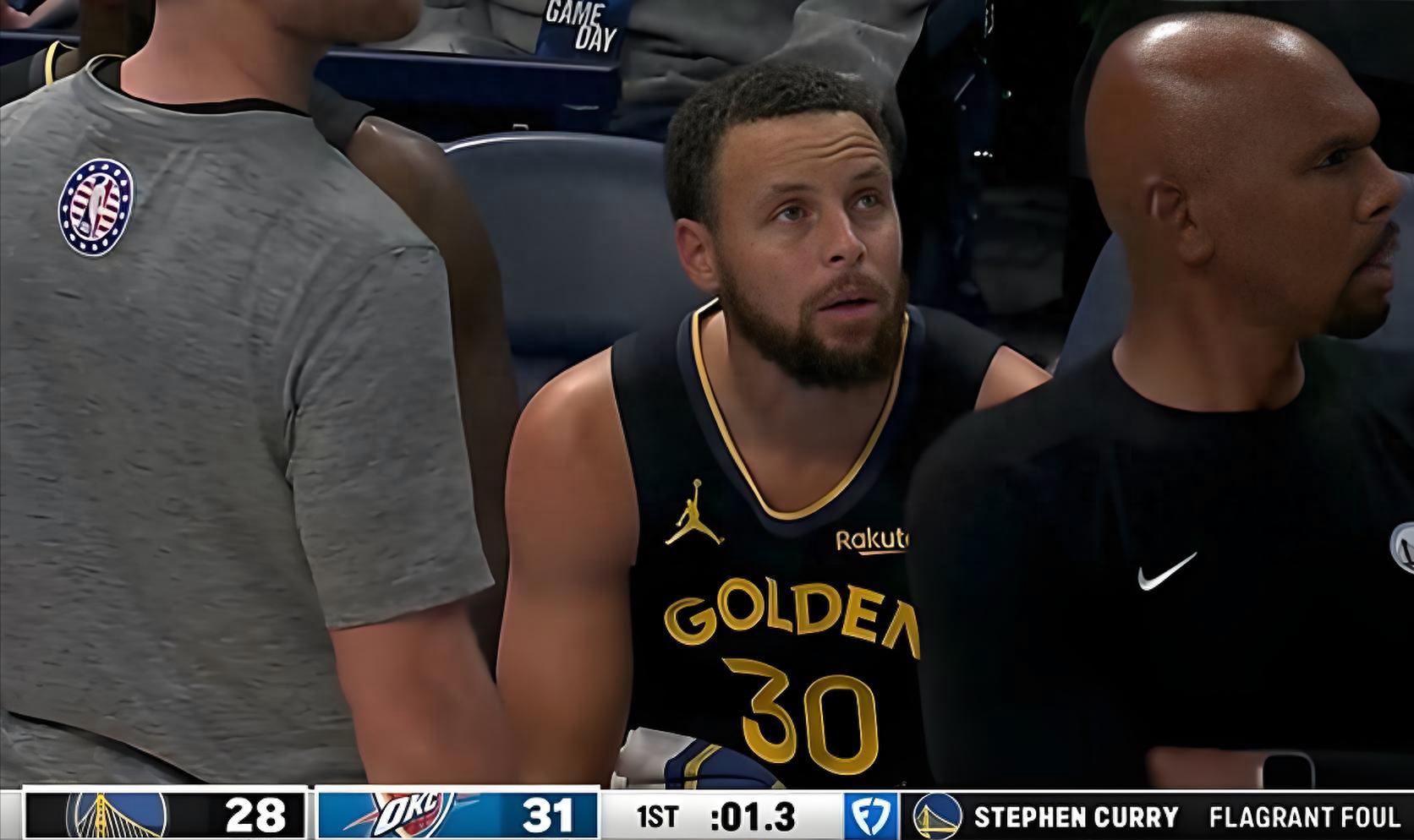 金州勇士与俄克拉荷马雷霆的比赛中,斯蒂芬·库里在首节最后时刻防守雷霆球员以赛亚·乔的三分投篮时,扑防过程中右脚不慎侵入了对方的落地空间。