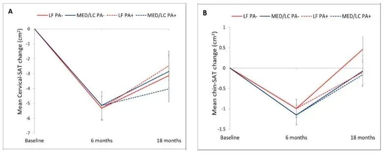 在一项为期18个月的随机对照干预研究中,参与者通过饮食调整和生活方式管理后,颈部皮下脂肪在6个月时减少了13.1%,18个月后仍保持约5%的下降(图2)。而这种变化,与体重和内脏脂肪的下降是同步的。