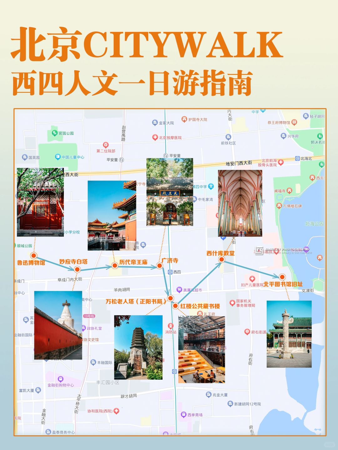 🔁路线:北平图书馆——西什库教堂——红楼藏书楼——万松老人塔——广济寺——历代帝王庙——妙应寺白塔——鲁迅博物馆