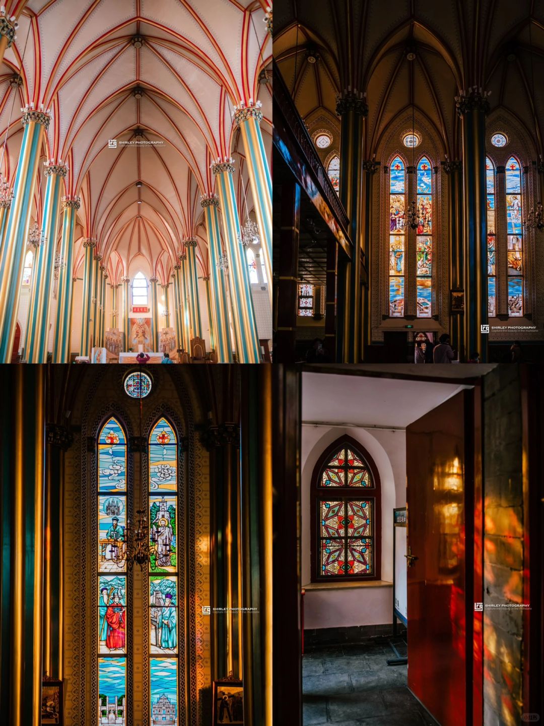内部有精美的彩色玻璃花窗,晴天时光影绝美