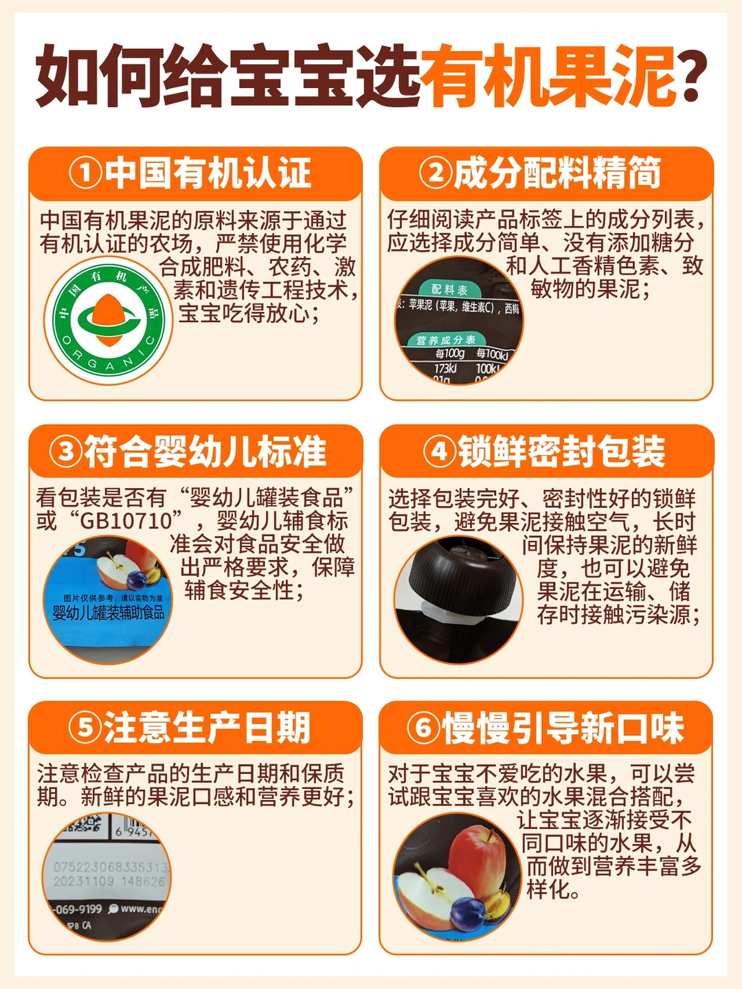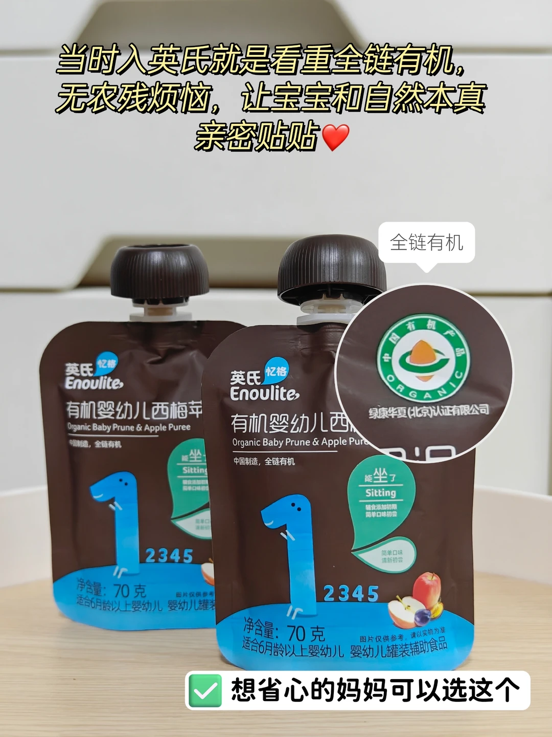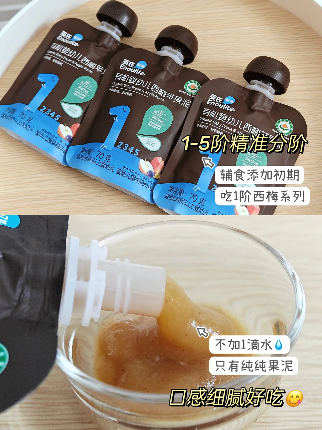 当宝宝从纯喝奶期过渡到开始添加辅食的阶段,如果辅食添加方式不得当,可能会导致宝宝拒绝辅食、厌奶,甚至噗噗[大便R][大便R]不适应。 小宝宝肠胃还很脆弱,因此除了给宝宝添加必要的米糊 、肉碎、菜泥, 🍎也要记得给宝宝添加膳食纤维丰富的果泥哦❗ 但是果泥添加有讲究!一样要注意食物排M、食物性状! 🔍初添加时不能太多,一两勺让宝宝品尝、适应,宝宝接受后再逐渐增加到25g、50g、100g,3岁前不超过250g/天; ❌拒绝来源不明的水果,不安全!我家一直给咘咘吃的是有机水果,不仅营养价值更高,还严格检测农残! . 对于忙碌无暇自制辅食的宝爸宝妈们,可以选择成品有机果泥,但是需要注意: ✅认准有机认证:中国有机认证更严格,优先选择全链有机,土地、种植、生产全过程有机标准,更安全健康; ✅成分配料精简:仔细阅读产品标签上的成分列表。选择成分简单,没有添加糖、香精色素、防腐剂的果泥 ✅符合婴幼儿标准:看包装是否有“婴幼儿罐装辅助食品”或“GB10770” ✅隔氧锁鲜包装:有效防止果泥接触到空气,避免氧化或持续发酵,长时间保证果泥新鲜度; ✅注意生产日期:选择日期更新鲜的果泥,口感营养更好 ✅分阶设计:给宝宝添加果泥也需要循序渐进,不盲目,好的分阶设计让喂养更轻松,也能给宝宝成长最合适的营养补给 . 我个人是没有非要喂自制果泥的情节,因为照顾宝宝真的是件非常辛苦的事情,自制辅食和自制果泥我觉得只能hold住一样。 所以当时结合自己做的功课就选择了全链有机的英氏有机果泥, 💚配料表干净,只有有机果泥,也不加一滴水,能够给宝宝自然的味蕾接触,真的让人非常安心, 而且他们家的1阶西梅泥真的很适合作为宝宝的第一口果泥,🍎苹果/🍌香蕉/🍐梨+西梅都属于低敏果类,膳食纤维又很丰富,宝宝小肚肚的好管家。 后面我也按照它家提供的1-5阶分阶喂养体系🟢(这一点是妇幼认可的),逐步尝试了其他阶段的果泥,真的让我觉得很省心,宝宝月龄只是参考,更结合了生理、营养需求、感知力好几个方面,非常科学! ✅锁鲜包装,每次日期也很新鲜,总的来说,如果你正在找寻宝宝的第一口果泥,我建议试一下,它比我们自己搭配的效果要好得多!