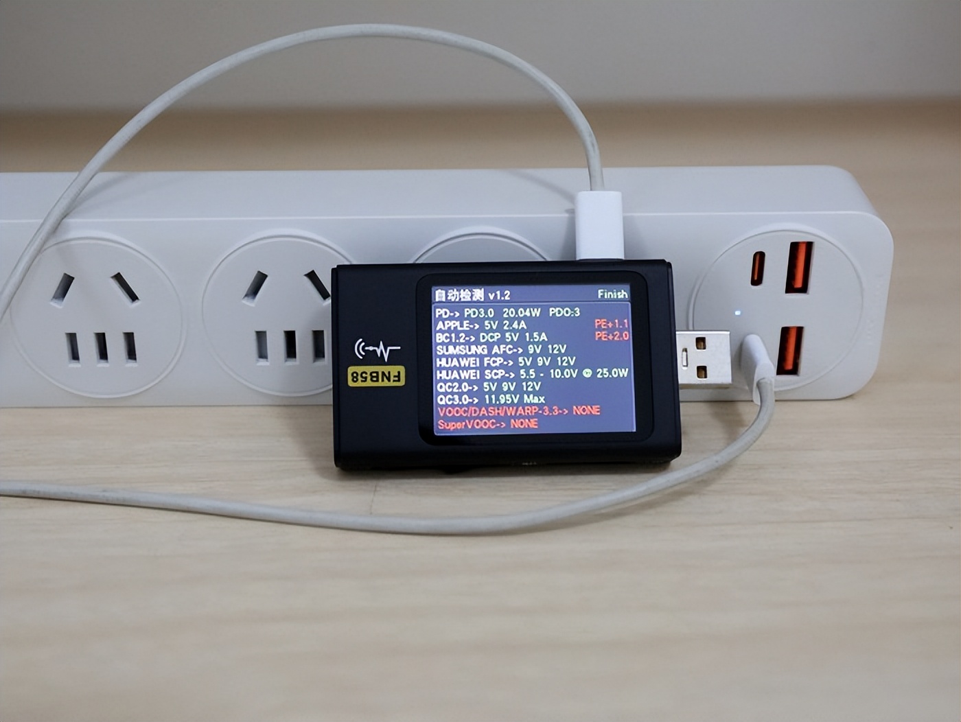 接下来我们用测试仪看下这款排插都支持哪些充电协议,这里以USB-C1为例,可以看到支持的协议有PD、APPLE、QC、BC以及AFC、FCP、SCP多个快充协议,如果有对应手机(尤其是华为和苹果),充电速度会更快。