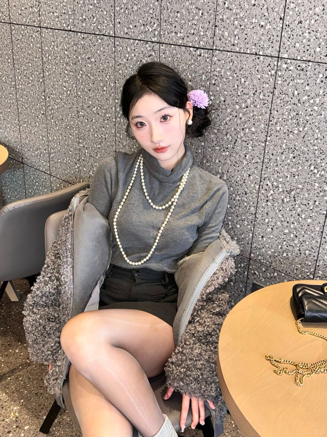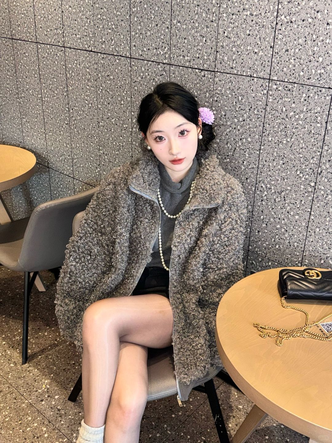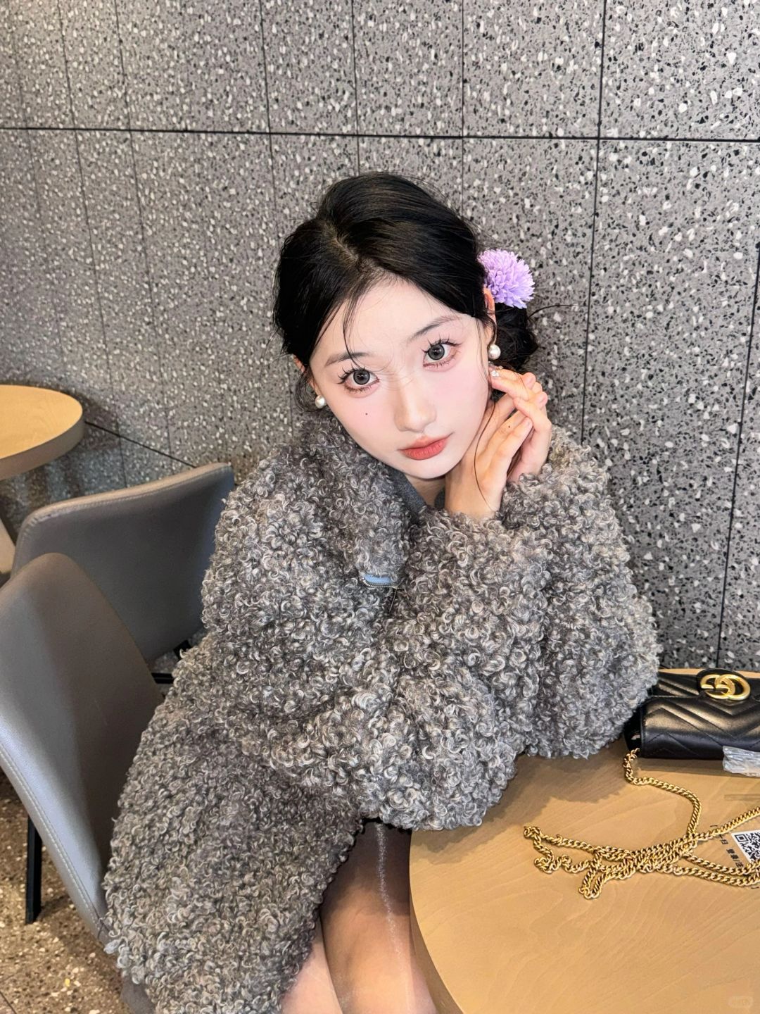 花朵发夹+灰色羊毛卷外套+灰色半身裙