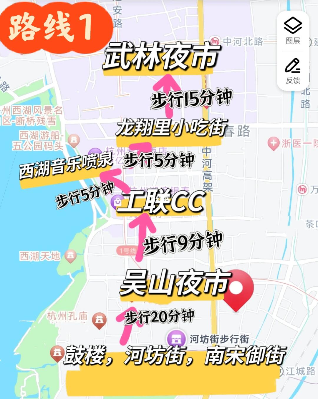 南宋御街-河坊街-吴山夜市-龙翔里小吃街-西湖音乐喷泉-武林夜市