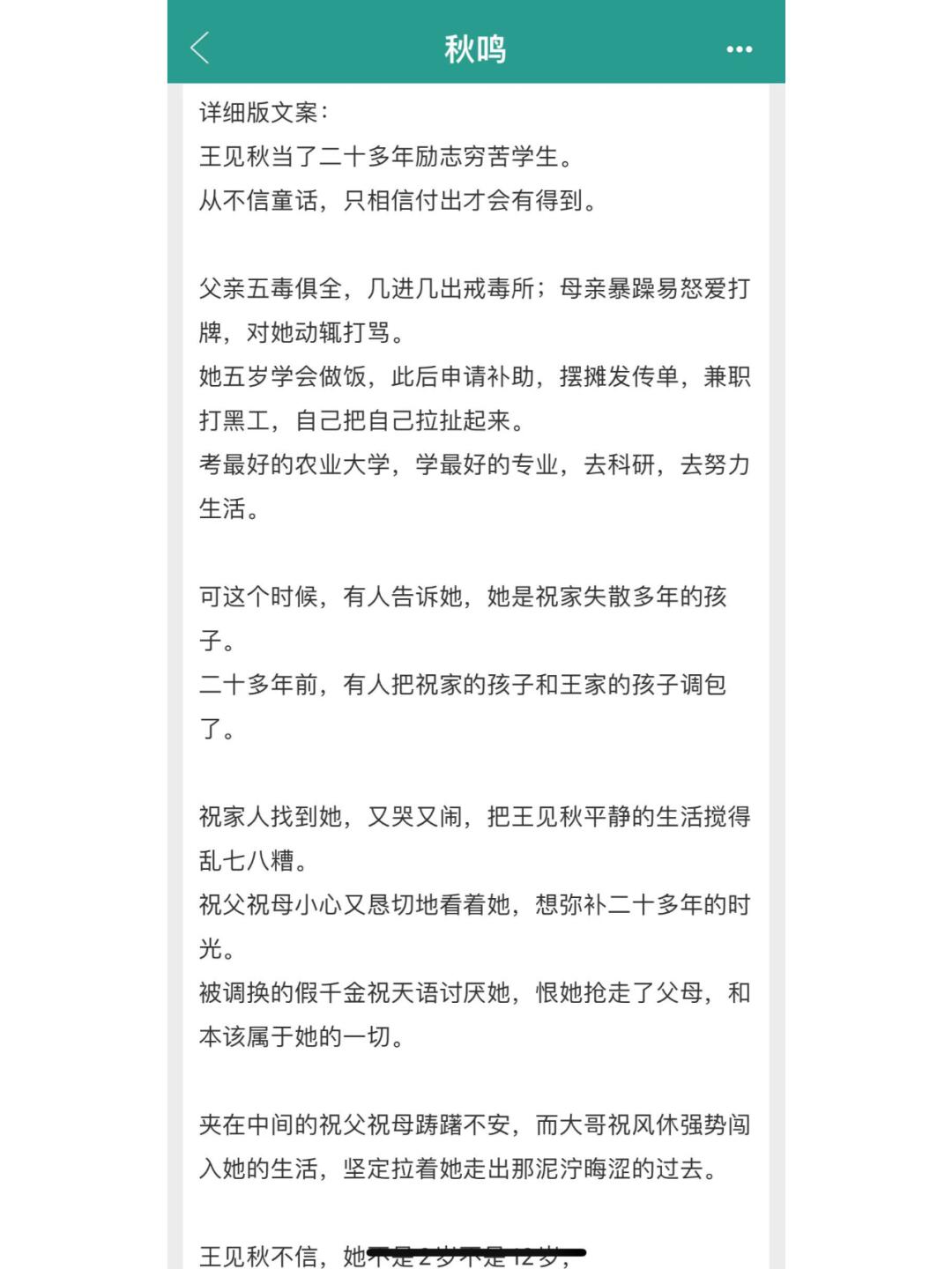 *故事讲述的是一个换错孩子的老套故事,但后续走向不同于以往的套路,不是爽文打脸,主亲情治愈向。所以还是推荐给大家,希望大家闲暇之余可以看看。