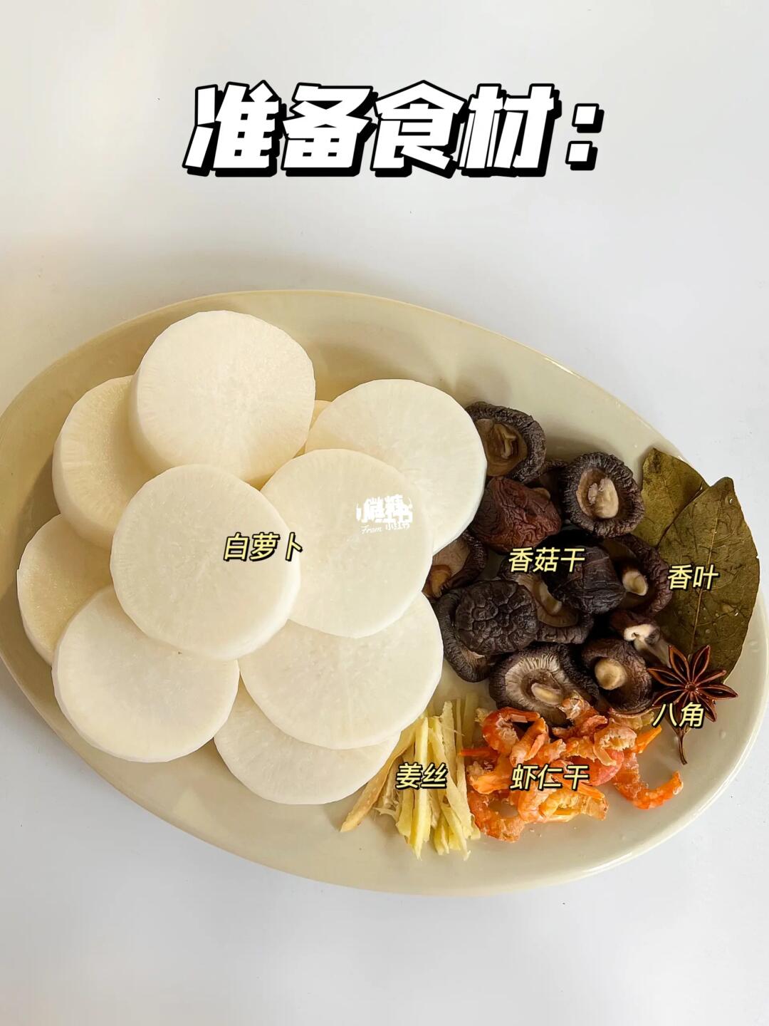 白萝卜,香菇干,虾干,一片香叶,一个八角,葱,姜