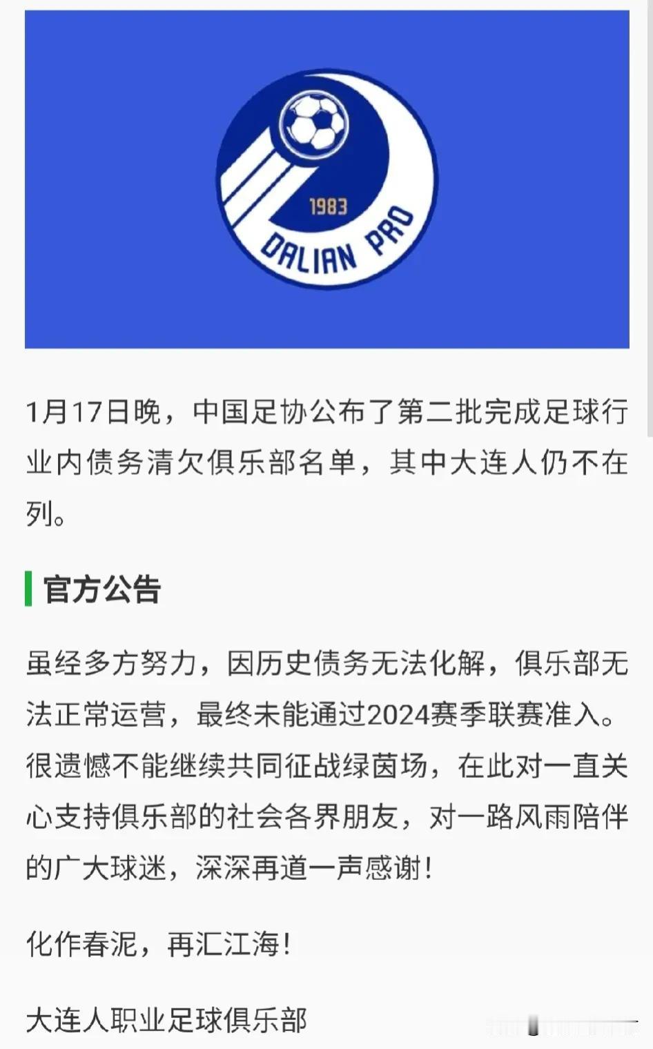 又一球队解散。随着第二批完成足球行业内债务清欠的俱乐部名单公布,大连人宣布解散,大连人23赛季联赛排名15名,遭遇降级,今年未通过准入,因历史债务无法化解,俱乐部无法正常运营,最终宣布解散!#一起来聊聊中超#
