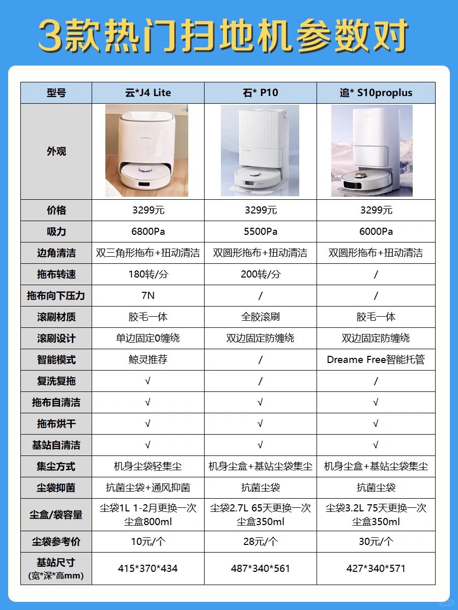 👉🏻对比了3款热门扫拖一体机:云鲸J4 Lite、石头P10、追觅S10proplus,得出以下结论: