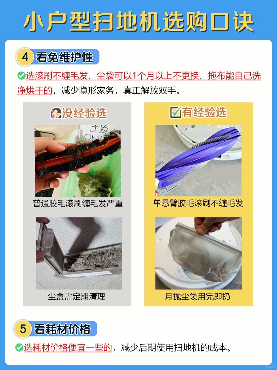 选滚刷不缠毛发、尘袋可以1个月以上不更换、拖布能自己洗净烘干的,减少隐形家务,真正解放双手