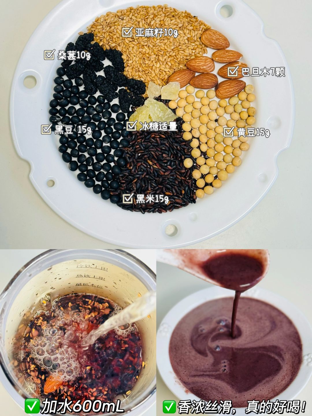 将所有食材放入破壁机中,加600mL清水,豆浆模式即可,一般我都是早餐去喝它,真的很不错。