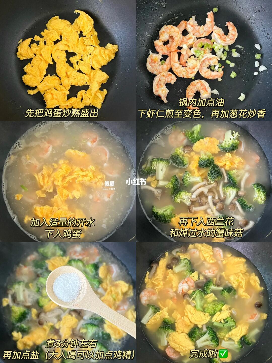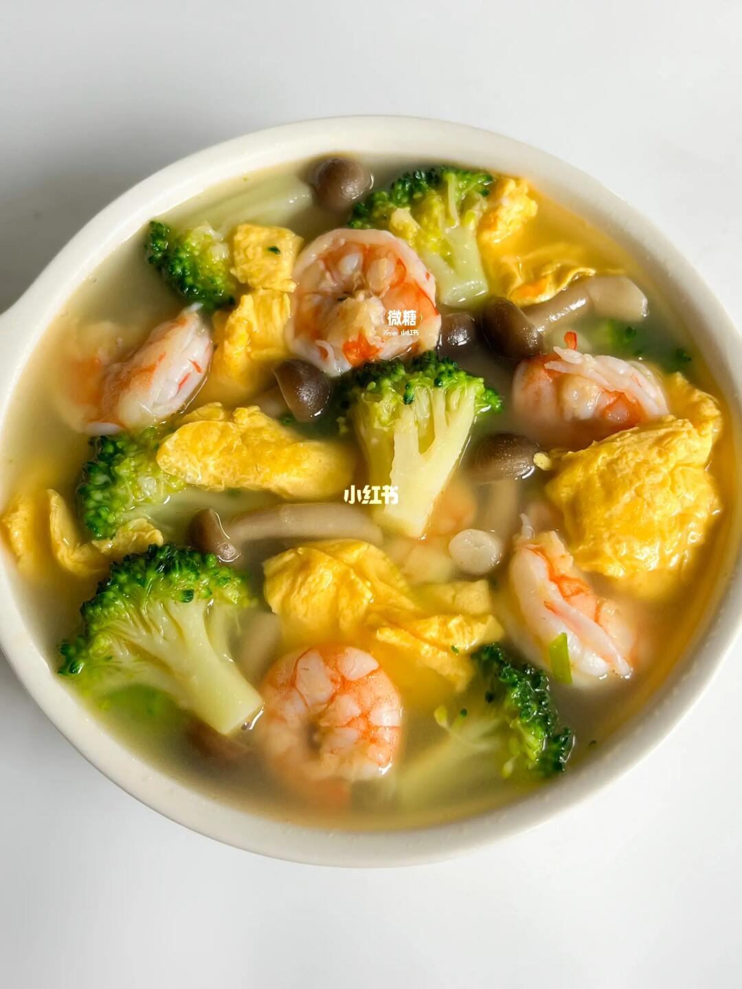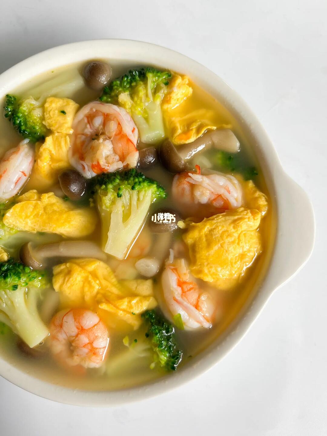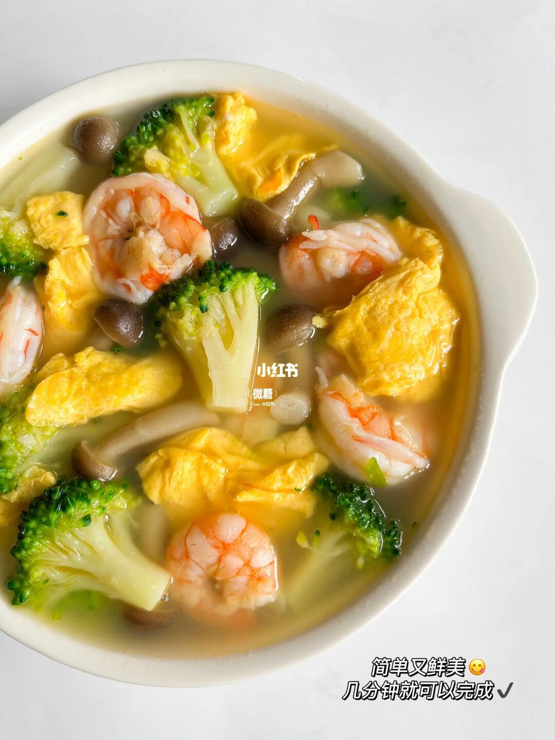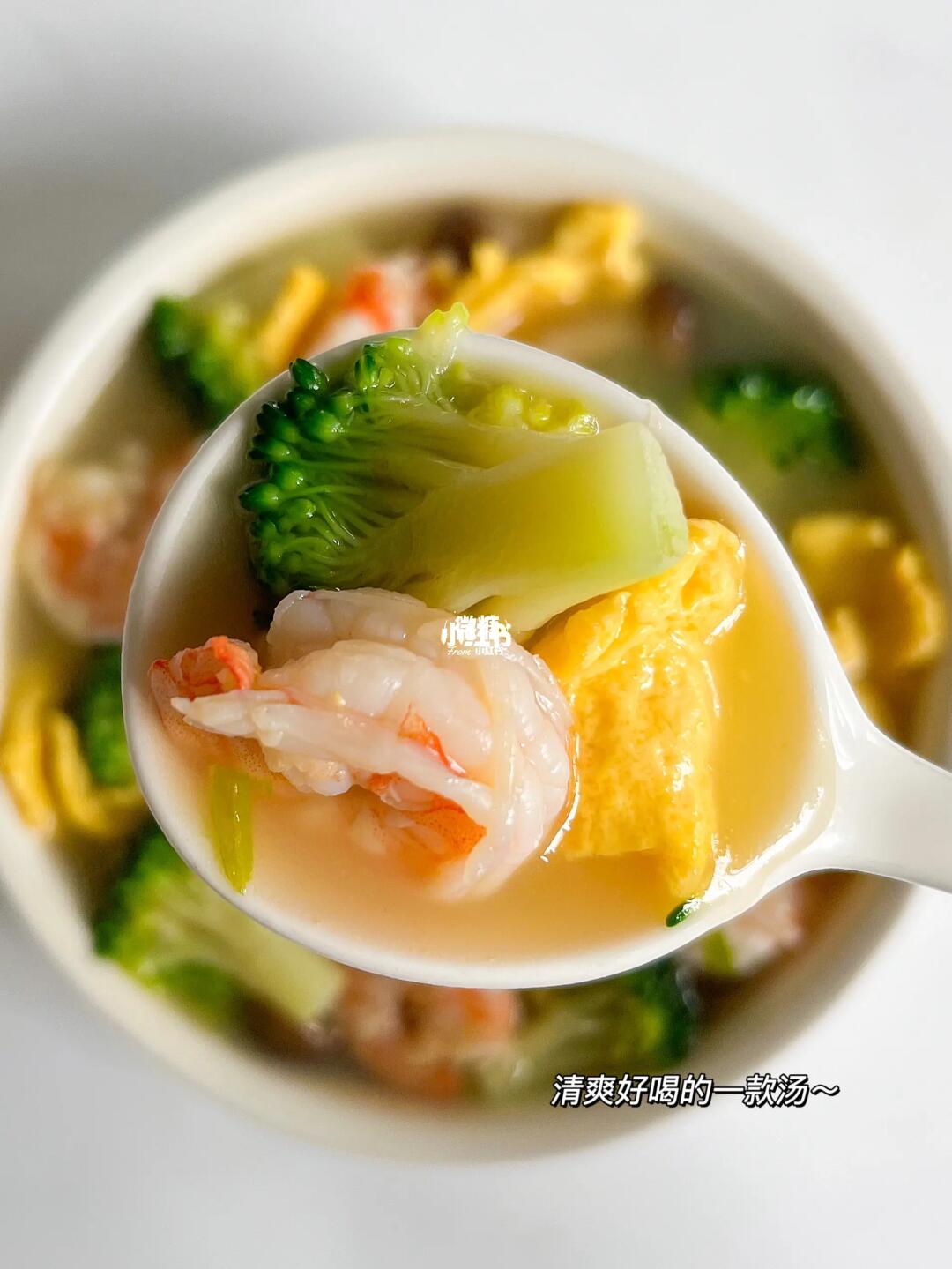 今天分享一碗几分钟就可以完成的西兰花虾仁汤✅除了平时家里煲的各种汤,这种简单快速的生滚汤在我家也是经常做的。鲜美又好喝,清淡不油腻,营养健康,家里小孩也很爱‼️ ⭕️准备食材: 虾仁,西兰花,菌菇,鸡蛋 👩🏻🍳做法: 1️⃣先把鸡蛋炒熟,盛出备用 2️⃣锅内加油,下虾仁炒至变色,再加入葱白炒香,加入适量的开水 3️⃣加入鸡蛋、西兰花、焯过水的菌菇,一起煮3.4分钟 4️⃣最后出锅前加点盐。大人吃的话可以适量加一点鸡精和胡椒粉✅ 也非常适合减脂的姐妹们当晚餐吃哦~