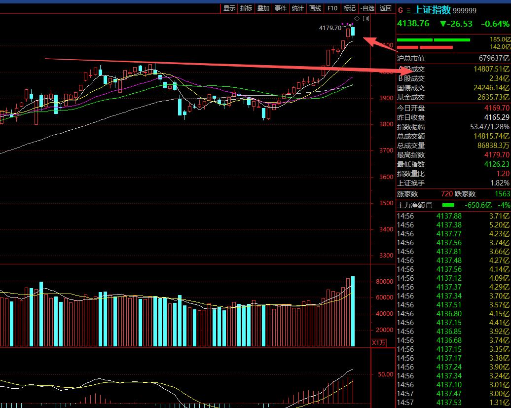 大盘今日高开低走,盘中虽又创了新高,但由于商业航天方向大幅杀跌,导致市场恐慌情绪漫延,券商和保险护盘失败,大盘终结了17连阳,收一根放量阴线;今日第一次强分歧,明有望修复。截止收盘,三大指数集体回调,上证跌0.64%,收报4138.76点;深证成指跌1.37%,收报14169.40点;创业板指跌1.96%,收报3321.89点。全市成交36991亿,较昨日36450亿放量541亿,续创历史天量。