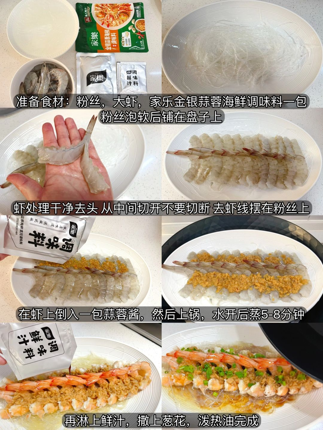 [庆祝R]鱼虾都是年夜饭上必不可少的食材,今天的蒜蓉粉丝虾也是用的家乐蒜蓉海鲜私厨酱,提前泡软粉丝,简单的把虾处理干净,再铺上蒜蓉酱就可以下锅了,出锅把料汁淋上,轻松搞定~金银蒜的搭配,既保留了蒜的香味,也不会过于辛辣~平时喜欢吃蒜蓉口味又懒得自己剁蒜炸蒜的宝子,多备上几包这个准没错~