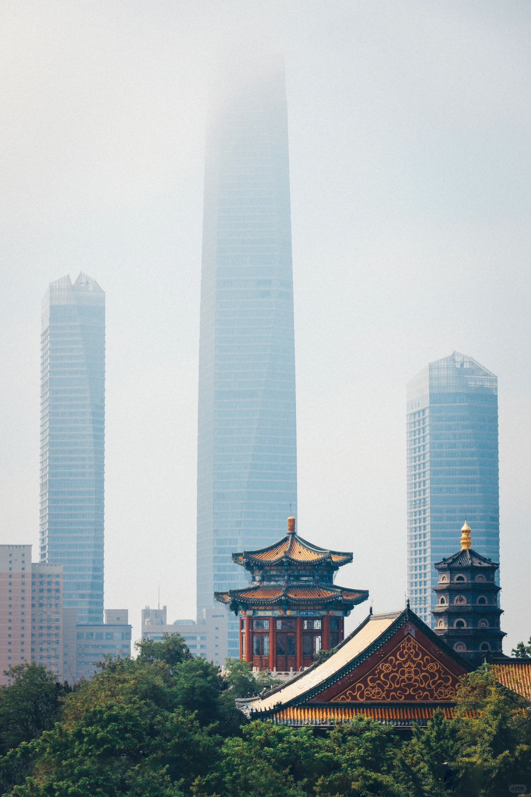 青岛古今同框机位,远处的湛山寺与浮山湾形成的一幅有趣的“上香画面”