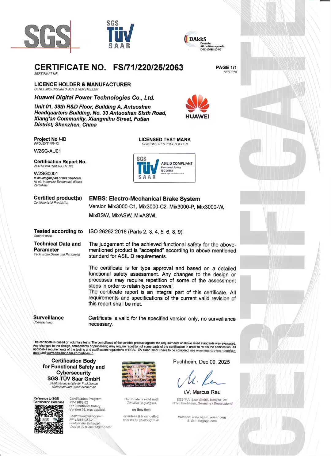 12月16日,华为数字能源对外披露了一项新进展:其融合驱动产品通过了国际认证机构 SGS 通标的审核,拿到了 ISO 26262 体系下、由德国 DAkkS 认可的 ASIL D 等级认证。