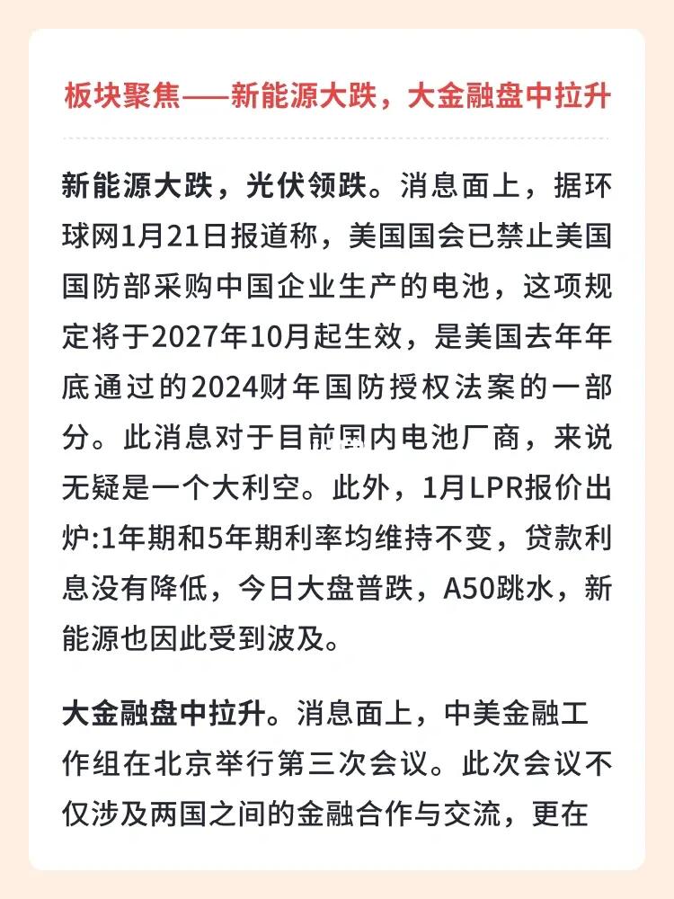 👉 新能源大跌,光伏领跌。消息面上,据环球网1月21日报道称,美国国会已禁止美国国防部采购中国企业生产的电池,这项规定将于2027年10月起生效,是美国去年年底通过的2024财年国防授权法案的一部分。此消息对于目前国内电池厂商,来说无疑是一个大利空。此外,1月LPR报价出炉:1年期和5年期利率均维持不变,贷款利息没有降低,今日大盘普跌,A50跳水,新能源也因此受到波及。