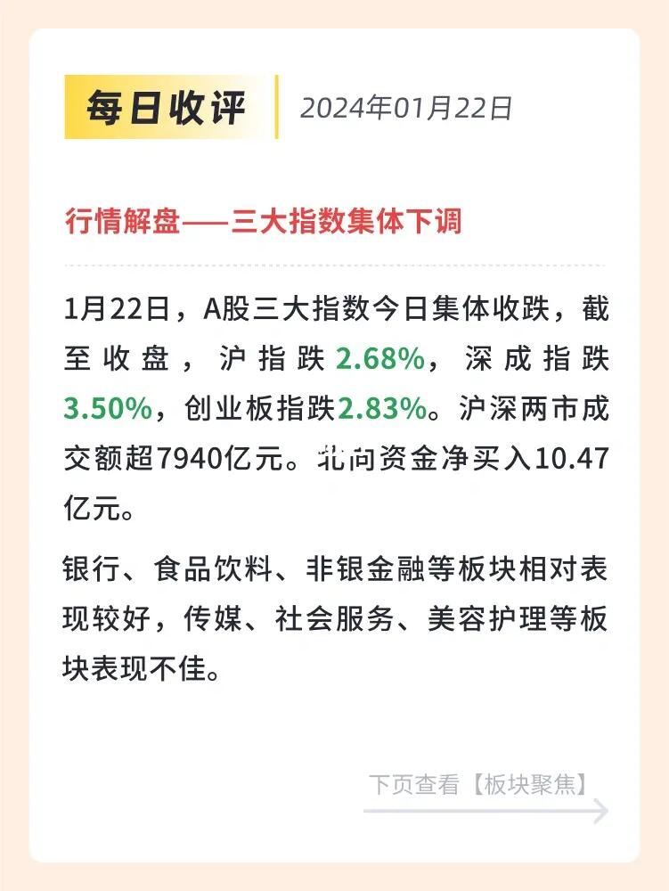 👉 1月22日,A股三大指数今日集体收跌,截至收盘,沪指跌2.68%,深成指跌3.50%,创业板指跌2.83%。沪深两市成交额超7940亿元。北向资金净买入10.47亿元。