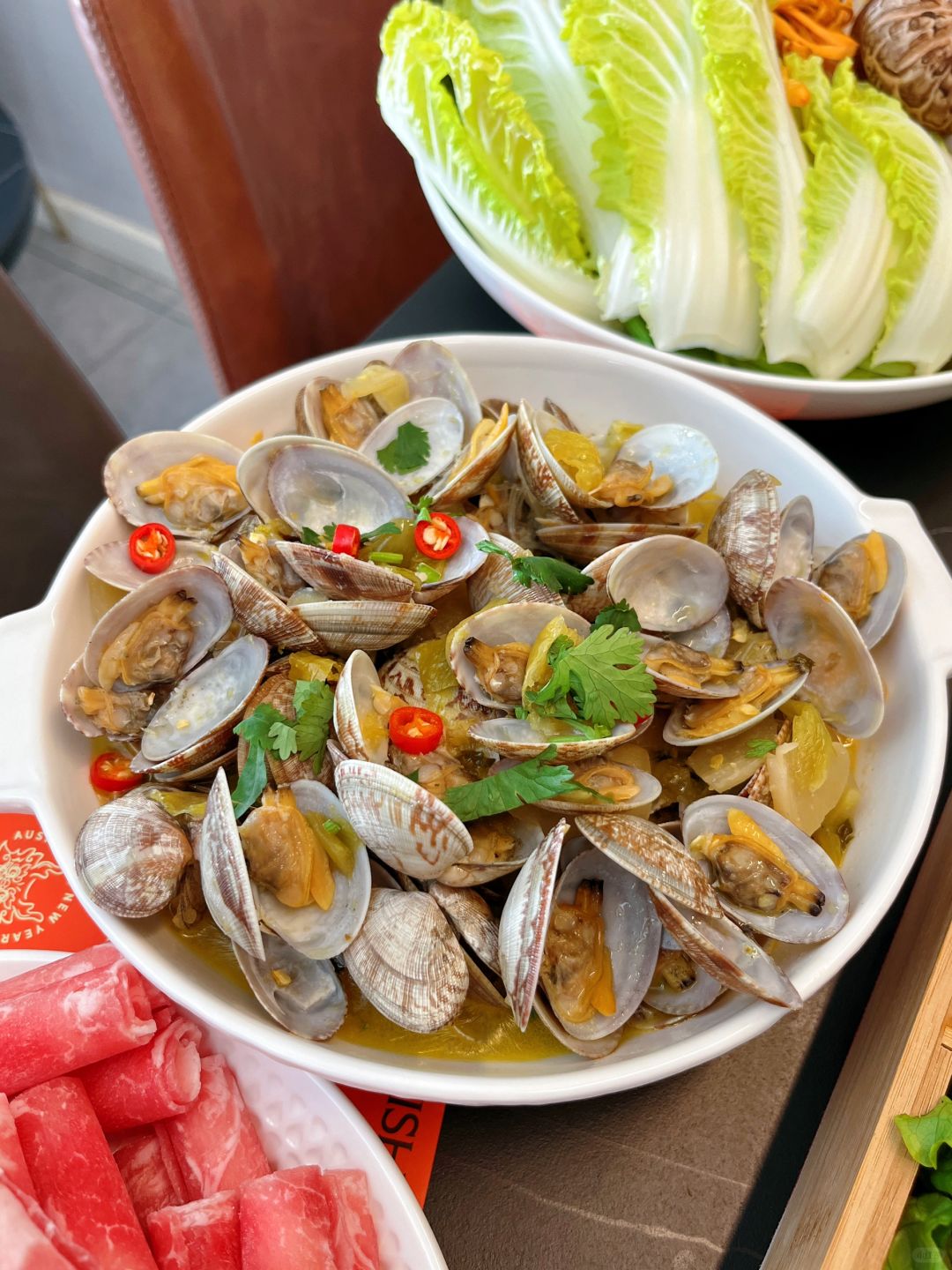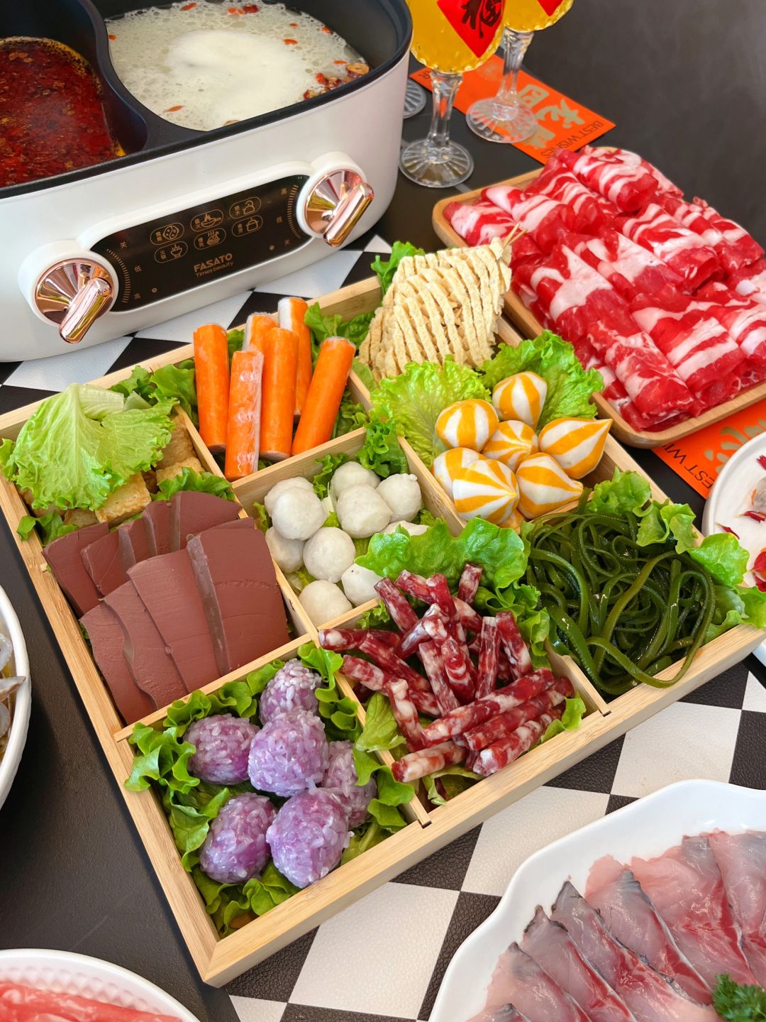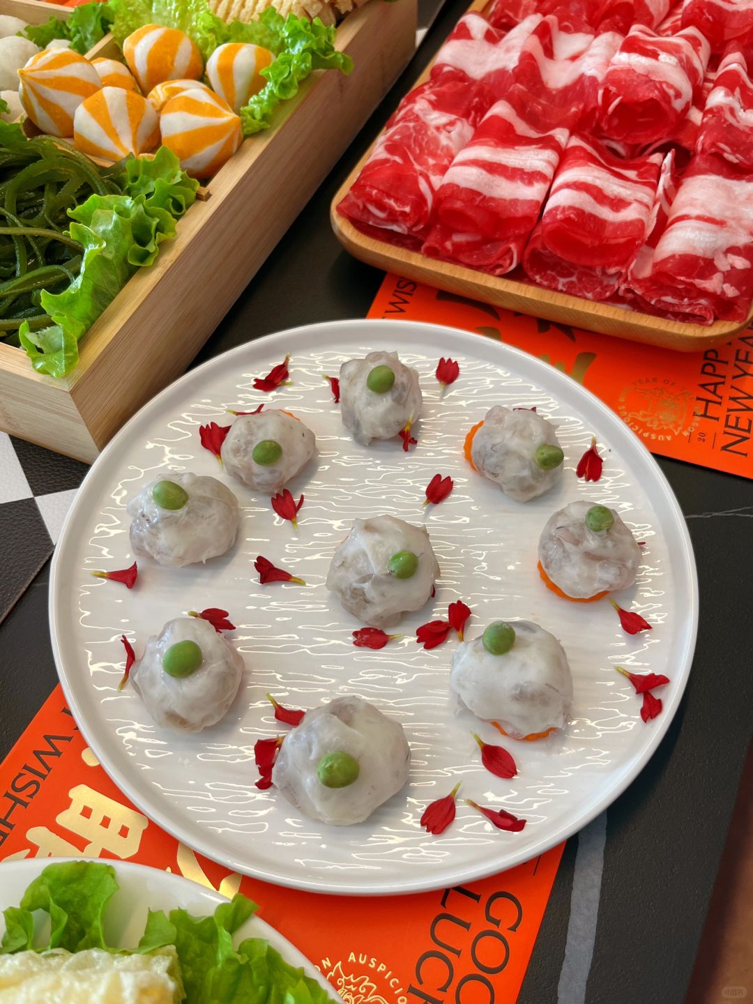 🥗火锅食材:肥牛卷 | 猪肉卷 | 鱼豆腐 | 鱼籽包 | 鱼丸 | 蟹棒 | 小腊肠 | 紫薯丸 | 鸭血 | 鲜鱼片 | 虾滑 | 肚丝 | 海带丝 | 响铃卷 | 菠菜 | 生菜 | 娃娃菜 | 金针菇 | 蟹味菇 | 花菇 | 虫草菇 | 木耳