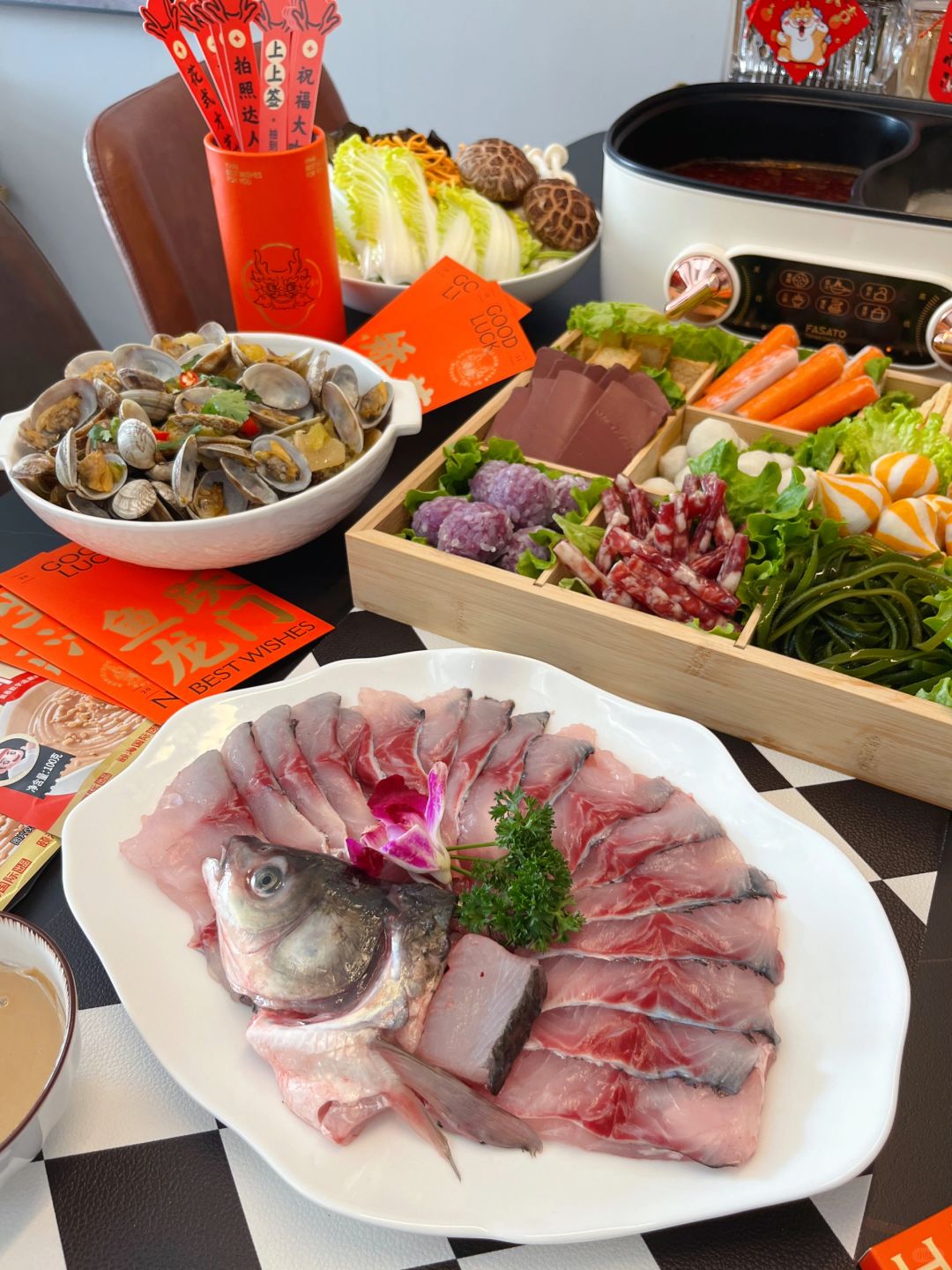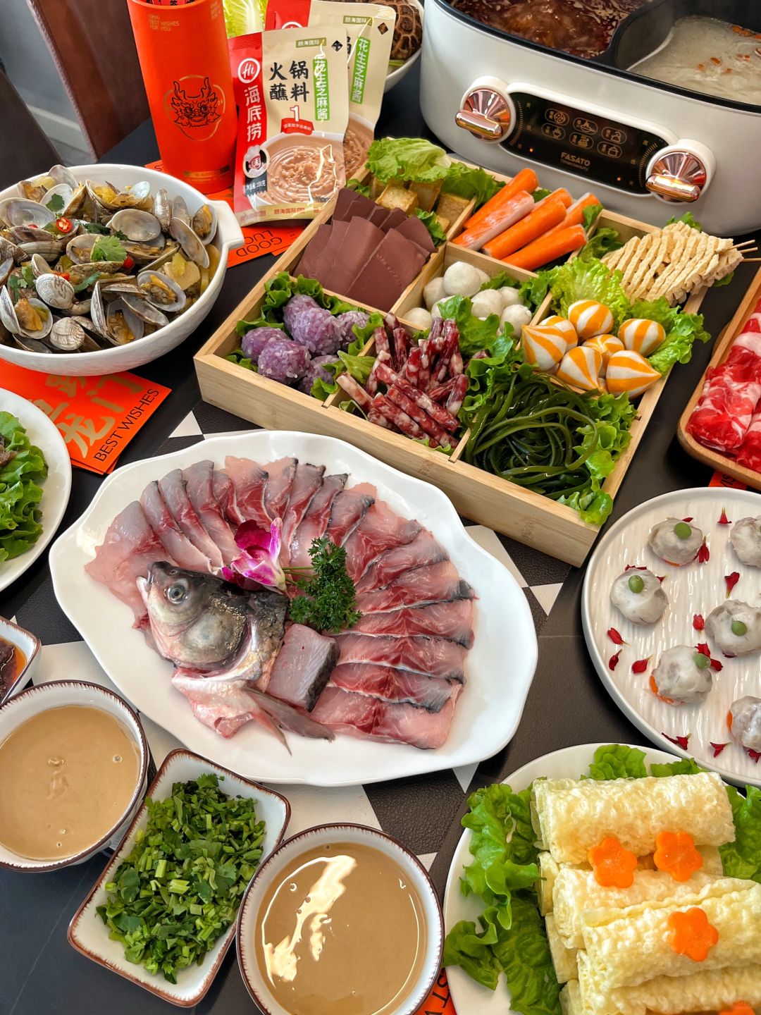 今天聚餐安排鸳鸯火锅~摆了满满一桌都是大家爱吃的食材仪式感直接拉满了,热气腾腾的火锅,寓意来年红红火火~