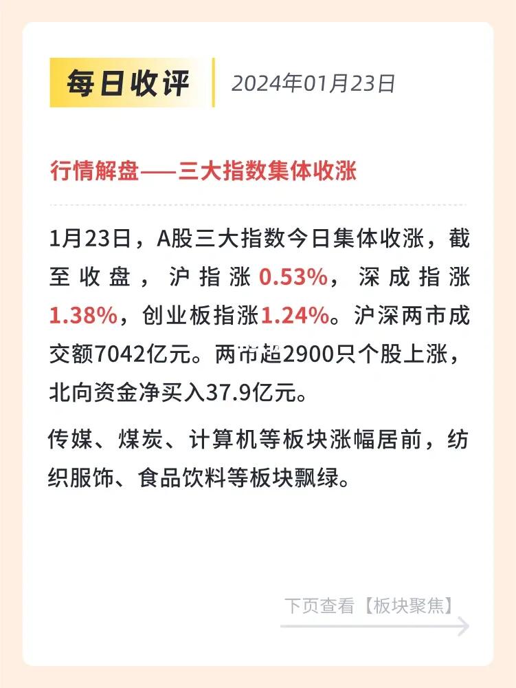 👉 1月23日,A股三大指数今日集体收涨,截至收盘,沪指涨0.53%,深成指涨1.38%,创业板指涨1.24%。沪深两市成交额7042亿元。两市超2900只个股上涨,北向资金净买入37.9亿元。