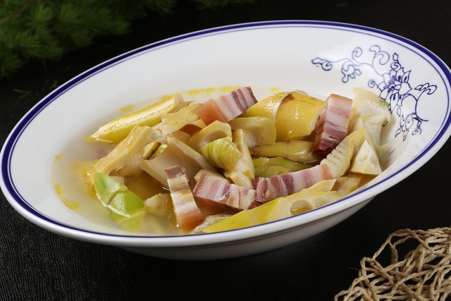 这道沪上名菜,以春笋、咸肉、鲜肉三味为主角。咸肉需选用金华火腿或自家腌制的五花肉,与鲜排骨同炖1小时,待汤色转白时加入焯水的春笋块,再炖半小时。咸肉的醇厚、鲜肉的清甜与春笋的脆嫩在砂锅中交融,无需任何调味,便成就一锅金黄透亮的春日高汤。苏州人还会加入莴笋和百叶结,让鲜味更加立体。