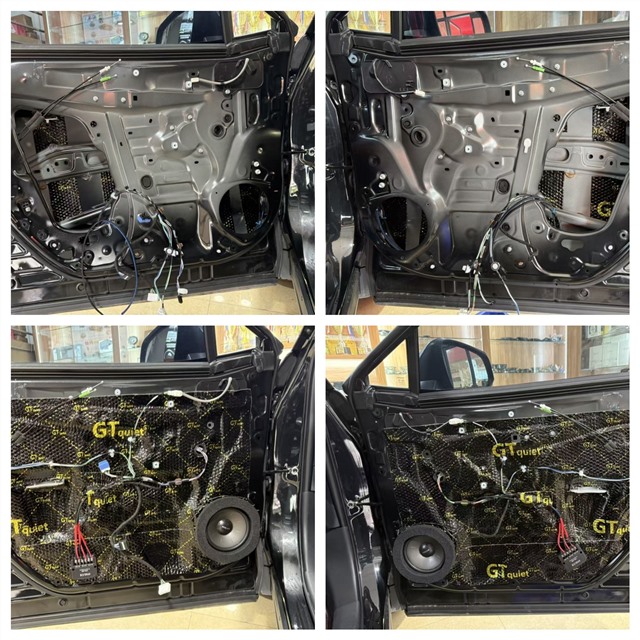 隔音施工是音响升级的关键一步,技师采用GT专业隔音材料,对前门板进行内外双层隔音处理,细致粘贴、压实,有效阻隔风噪、胎噪传入车内,同时抑制门板共振,减少音响播放时的杂音。隔音完成后,将弗莱德FDK-165两分频中低音喇叭精准安装在前门板原位,喇叭固定牢固,线路布置规范,避免后期出现松动或信号干扰;两分频高音喇叭则安装在仪表台两侧,贴合原车内饰,同时能实现更宽广的声场覆盖,让车主在驾驶位也能感受到沉浸式听觉体验。