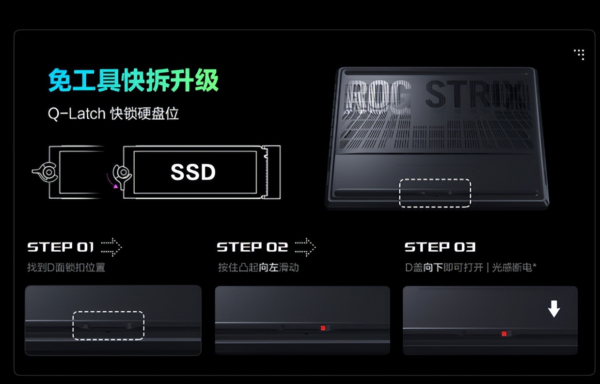 存储性能上,ROG枪神9采用16GB DDR5 5600MHz+1TB PCIe 4.0 SSD大容量组合,为多任务并行提供坚实保障,切换大型软件、运行高负载游戏时依旧流畅如丝。更贴心预留了双M.2接口,方便扩展存储容量。搭配免工具快拆设计,无需专业工具与技巧,徒手开盖即可优雅升级。