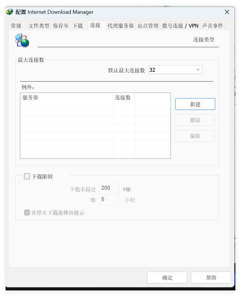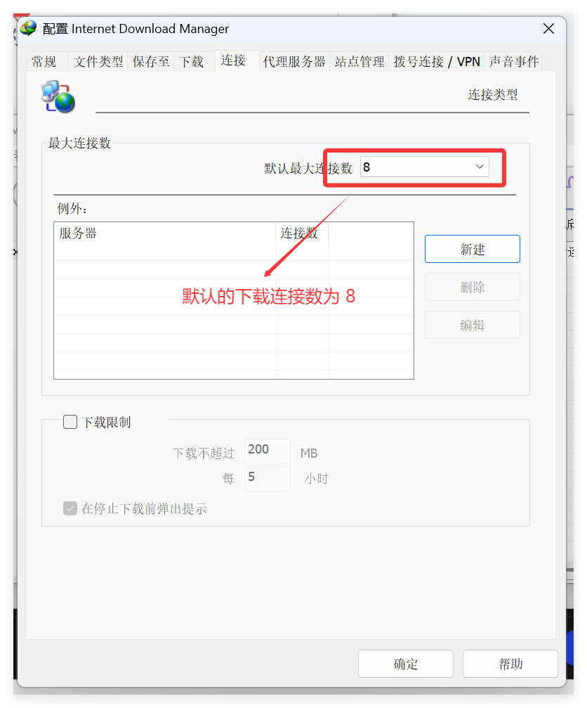 打开“选项”后,选择“连接”,可看到 IDM 默认的下载连接数为 8: