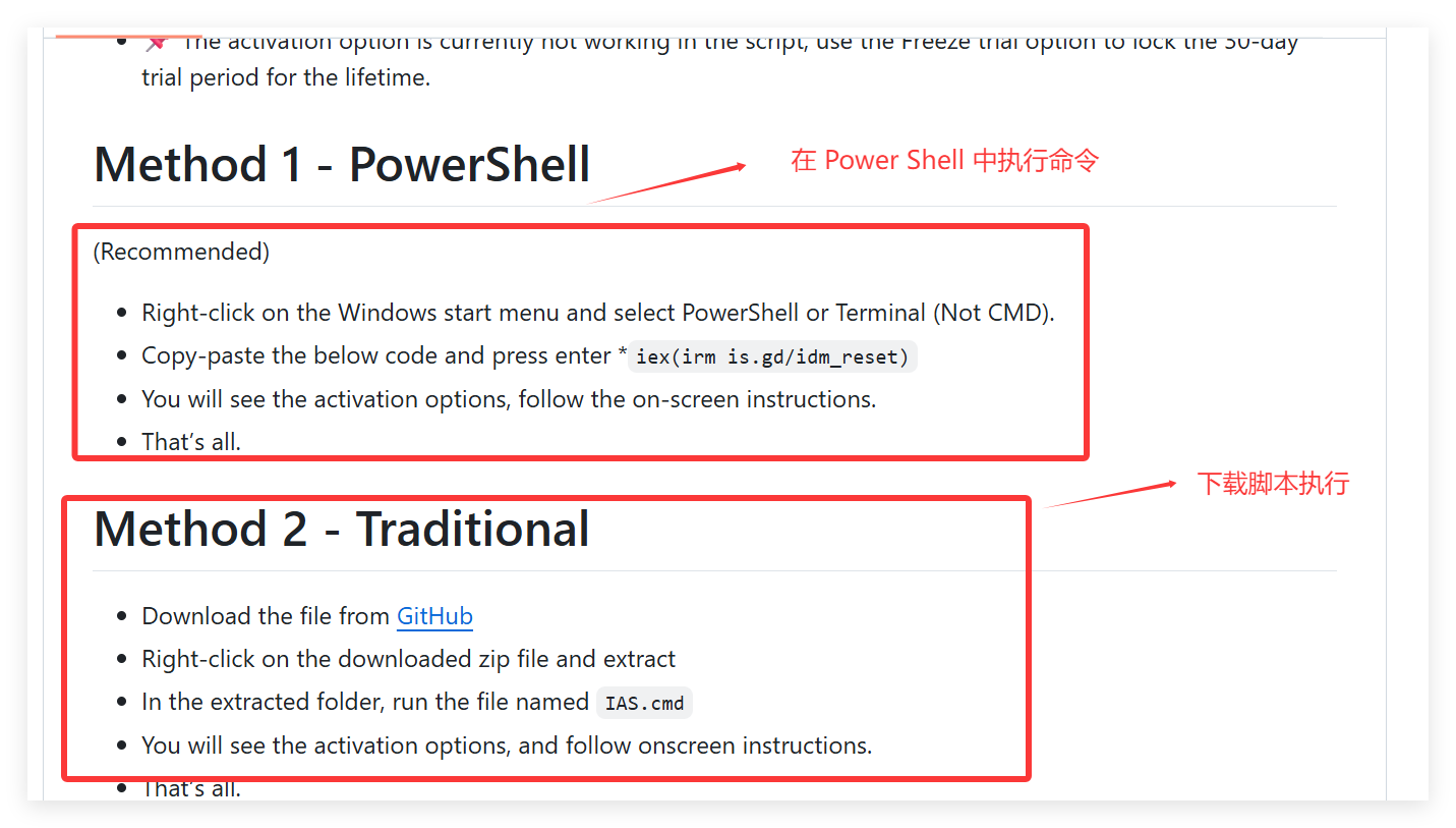 向下滑动,发现激活的方式有两种:在 Power Shell 中执行命令和下载脚本执行: