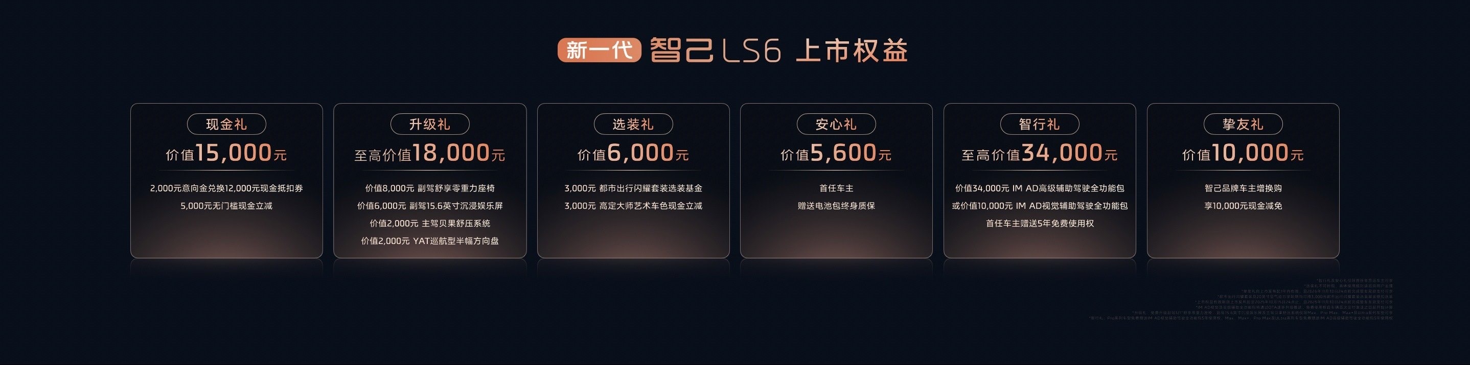 最后看定价与权益,新一代智己LS6的方案诚意十足。定价19.79万~26.99万元,超百项顶级配置(灵蜥底盘、Orin X芯片、800V超快充等)全系标配,避免“入门减配”;Pro版击穿20万门槛,纯电Max版20.99万、增程66 Max版22.99万,性价比突出。权益上,首任车主享电池终身质保、IM AD全功能包5年免费(预售用户终身免费),且“上市即交付”,感兴趣可登录“IM智己”APP或小程序下定。