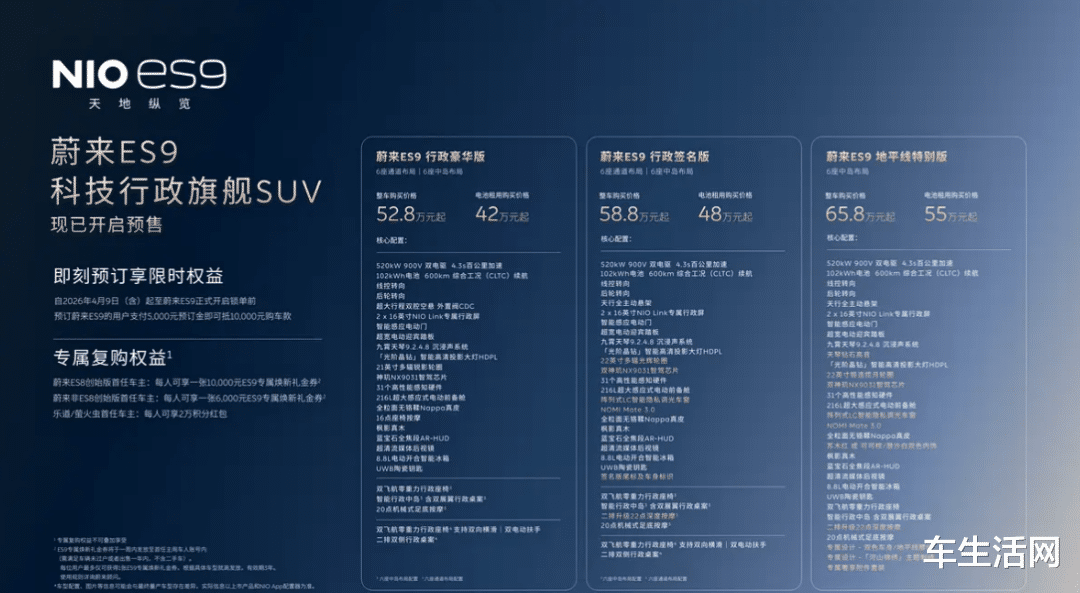 4月9日,蔚来ES9正式开启预售,整车预售价52.8万-65.8万元,BaaS电池租用方案下42万-55万元,预计5月底上市交付。作为蔚来十一年技术积淀的旗舰之作,新车以全尺寸体量、行政级座舱与全域自研技术为核心,切入50万+高端纯电SUV赛道,与理想L9、问界M9、传统豪华全尺寸SUV展开正面竞争。