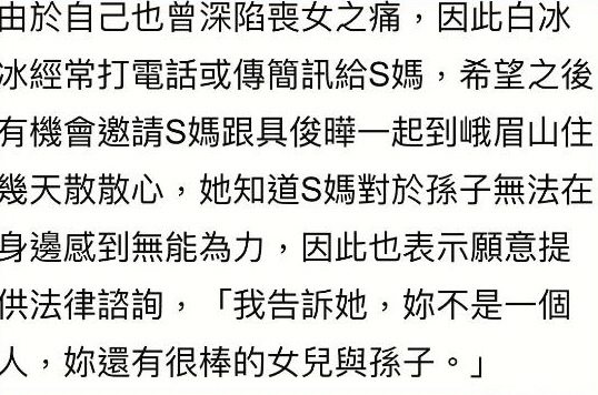 而近日与S妈同样有过白发人送黑发人经历的湾湾女星白冰冰透露,“S妈其实想要外孙回到自己身边,而她也为S妈提供了相关法律咨询和援助”。