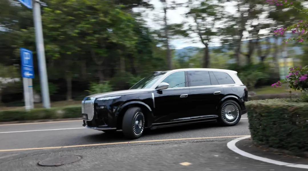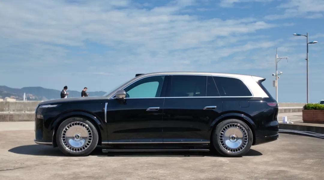 侧面也秉承了这一设计理念,3120mm的轴距配上5230mm的车长就足够霸气,而平直的窗线也将豪华理念贯彻其中。为了与霸气的造型相符,岚图泰山标配22寸镀铬大饼轮圈,搭配275/45 R22的倍耐力 P Zero轮胎。另外,我们这台车还使用了黑色+香槟金的双拼配色,更显豪华。